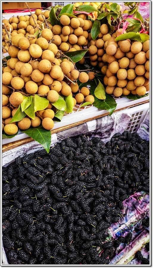 才國曆3月已經有龍眼上市了,我們沒興趣,是Vivian對下面黑黑的桑葚有興趣,一買就是2斤,一斤15人民幣,回到客棧拿出來品嚐可真好吃啊,又甜又多汁,Vivian說她隔天還要買,因為美國的桑葚沒這般好吃!