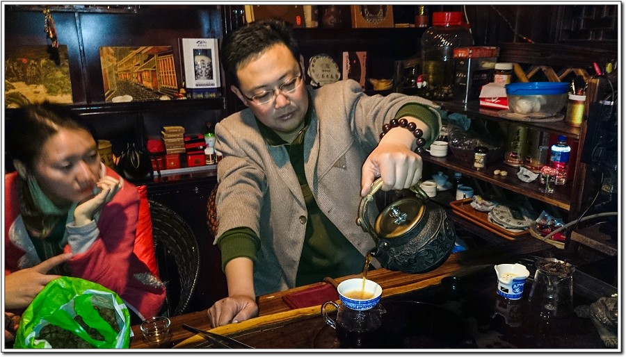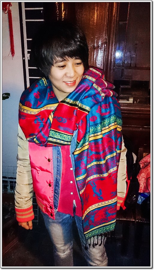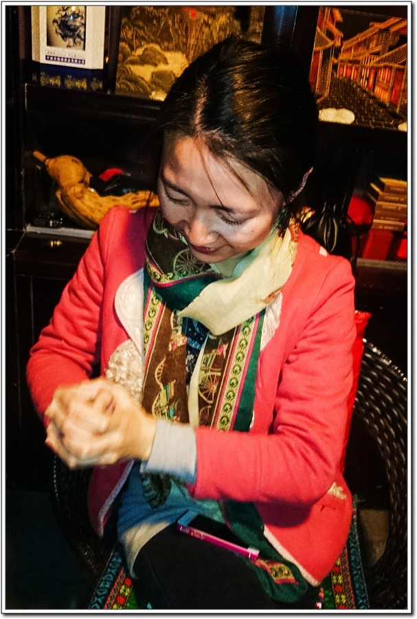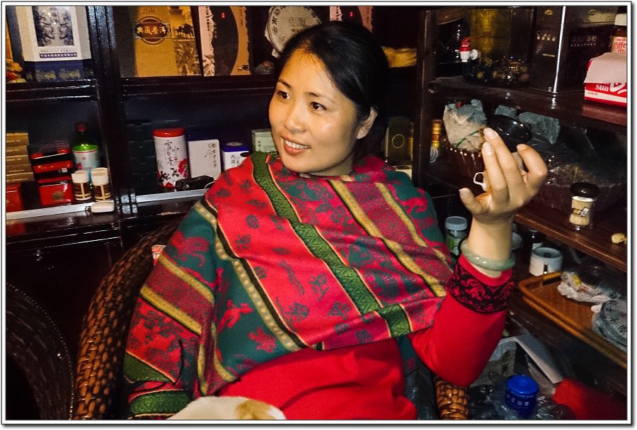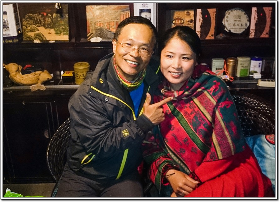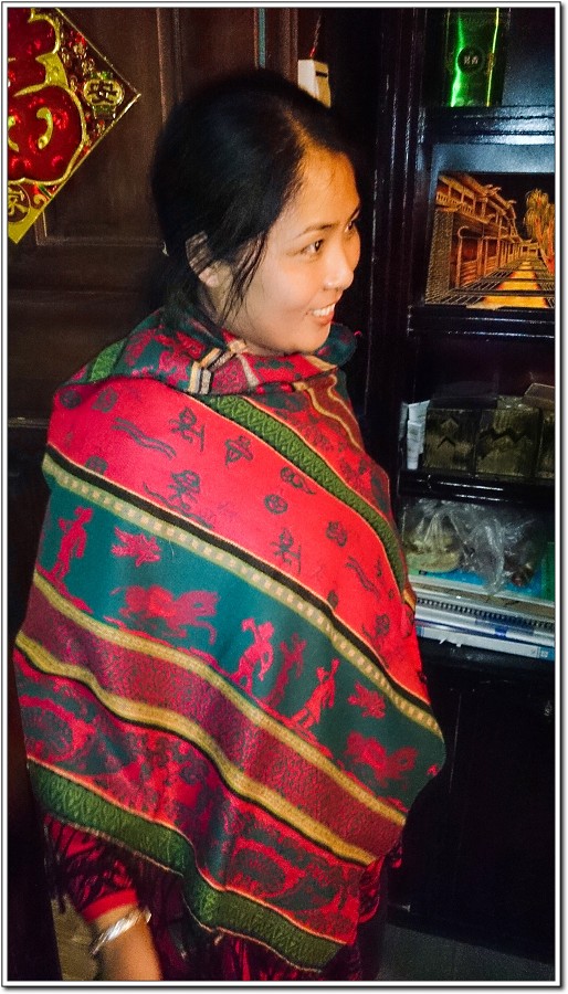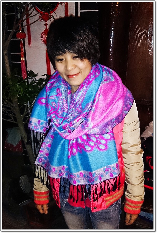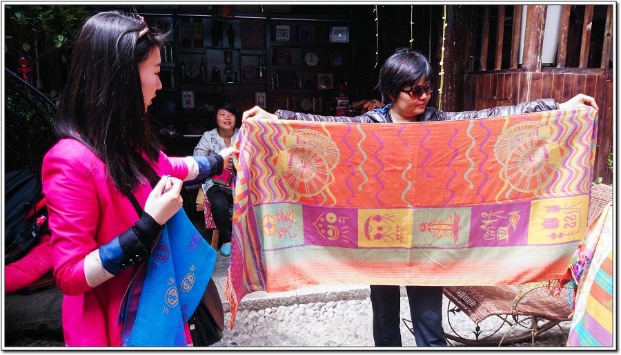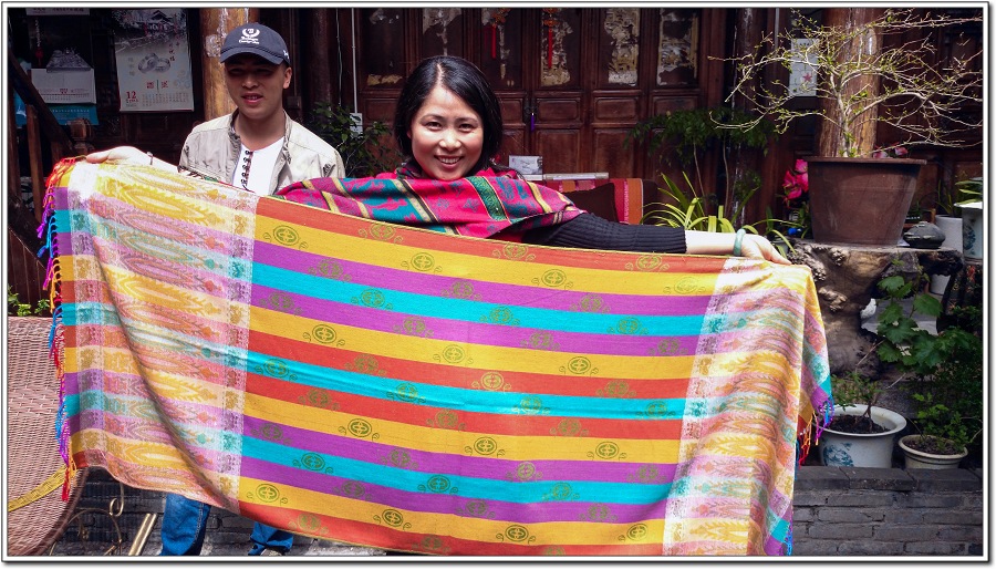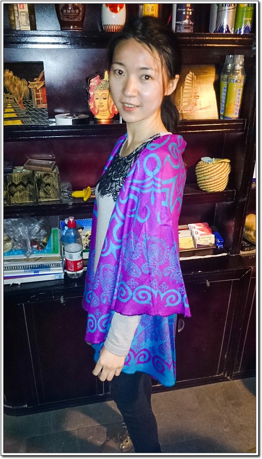 昨晚又受到『左耳鑽石客棧』李老闆熱情款待私藏珍品潽洱茶,老狼發覺老闆娘身上披的圍巾很好看,於是詢問價錢,沒想到老闆娘的胞弟就是在麗江從事絲斤、披肩等貨品的批發事業,大舅子很阿沙力給老狼驚喜價,是麗江古城一般店面的極低價格,老狼買了一堆,Vivian、Kevin、小可也加入敗家之列!