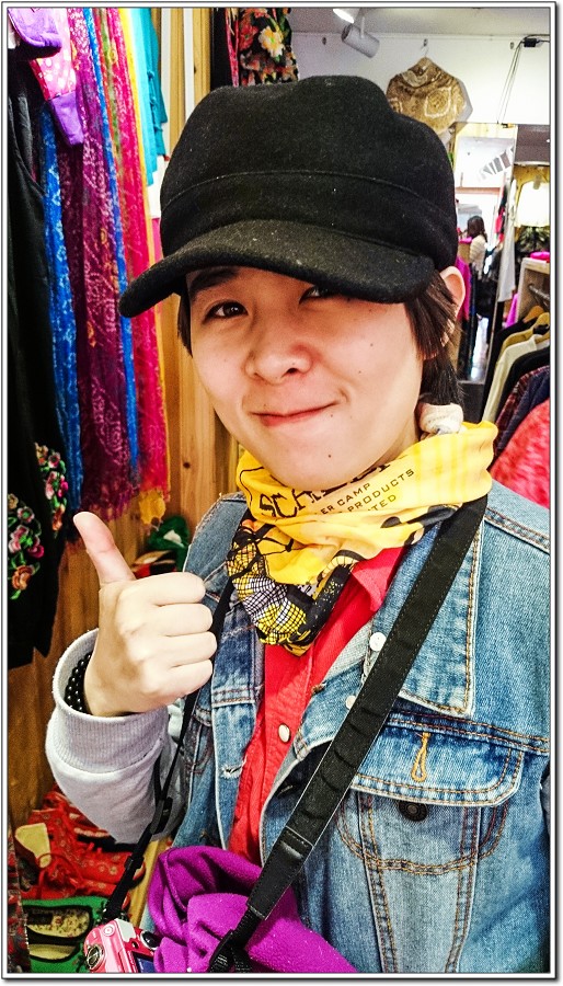 老狼幫小苗選購的黃色魔術頭巾,她喜愛的很!