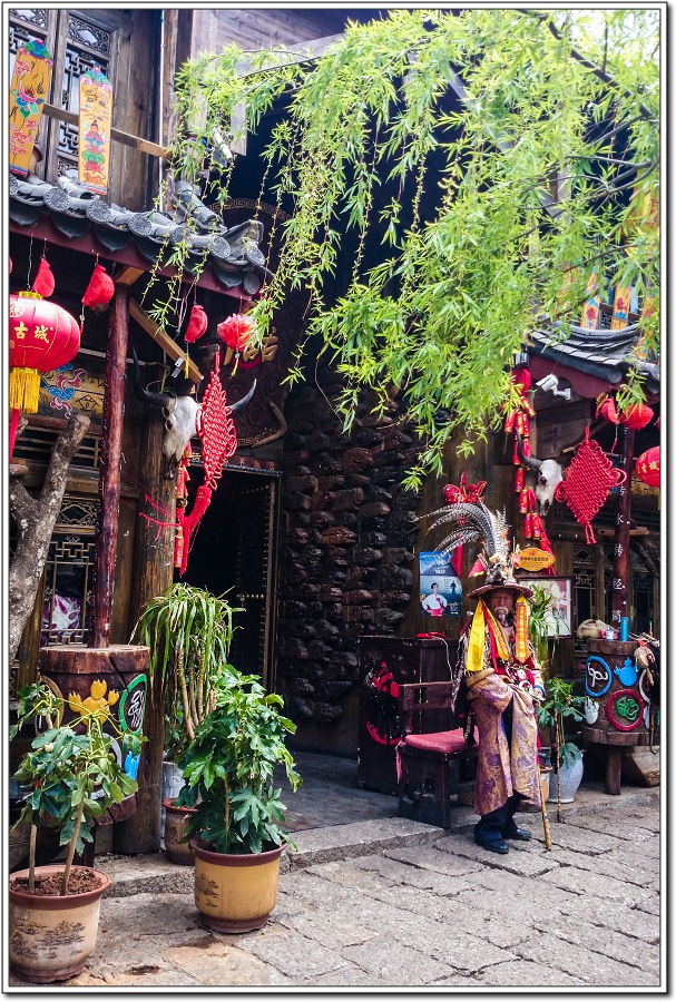 東巴劇團的『老東巴』在外頭拉生意,老狼2001年雲南之旅欣賞過東巴音樂劇,撐不到10分鐘就睡著了,不是東巴音樂劇不好看、不精彩,是上了年紀的老狼都會有的通病~坐著就睡,躺著又睡不著!