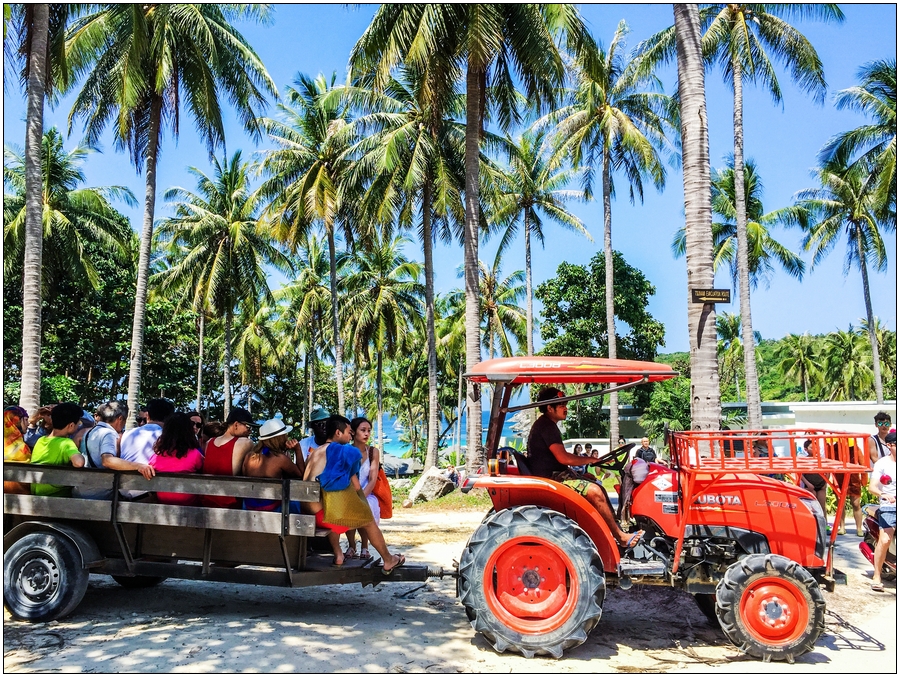 鐵牛車把我們顛運到另外一處海灘吃飯,島上沒公路、柏油路,高低破損不堪的泥土路把我們的腸子都顛出牛車外,還好老狼旁邊擠了一隻法國肉肉阿桑,是很實用的Cuchion,牛車按摩的很酥湖,還好沒讓她的兩顆小玉西瓜撞壞狼之臉!