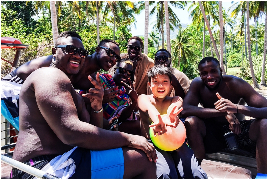 已經曬成『焦阿狼』的小狼在一群法國籍非洲黑人群裡頭還是最白嫩的一隻!
