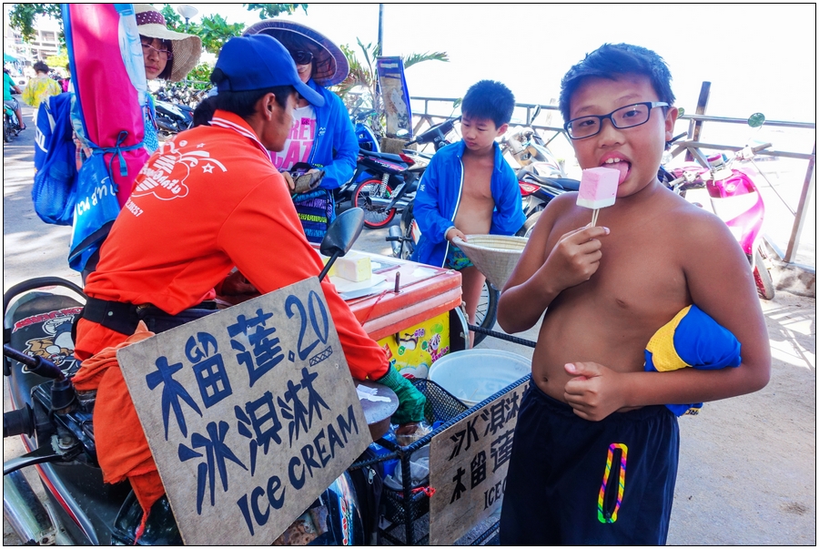 小狼手上那顆橘黃沙灘球是昨晚在全家便利店吵著要買給他的,這是最後一眼,下午離開皇帝島時他說被大陸小鬼拋球拋到警戒線外,沒人敢越線救球,那顆球被海浪捲進外海去了!