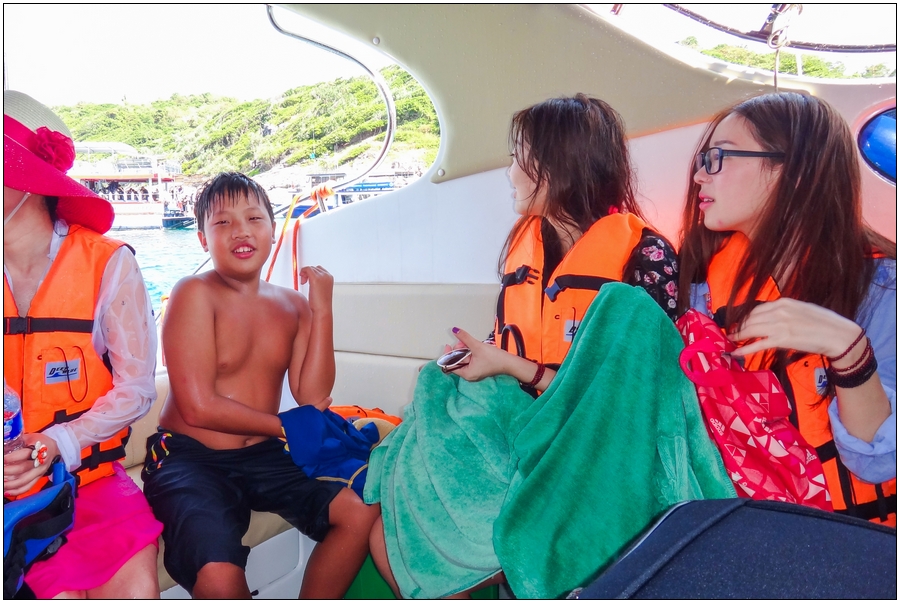 小狼今天跟二位漂亮姊姊出海遊並不開心,因為我們太晚上船,快艇暴衝噴灑上船的海水把他搞的很毛!