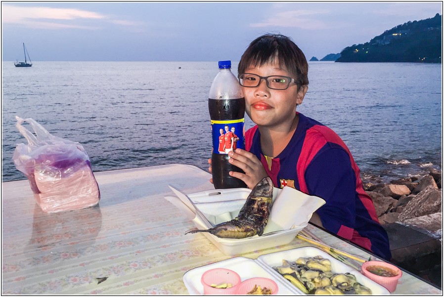 在卡塔衝浪之家玩3個鐘頭,傍晚參加幻多奇之旅,小鬼累了,隔天睡到中午才自然醒,我們在巴東街上午餐順便換泰銖,玩衝浪太燒錢了!