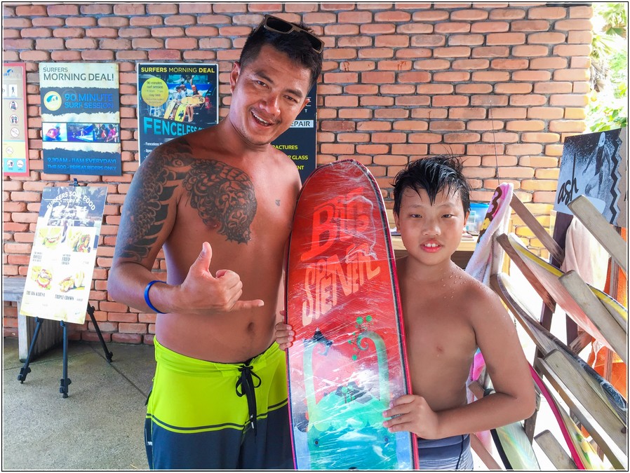 這裡販售的玻璃纖維沖浪板,一組標價從1萬5到2萬5千泰銖,不是很貴,只是買回台灣沒用,這款沖浪板只適用在這人工海浪池,不能在海裡衝真正的海浪,所以只讓小狼拍照過乾癮!