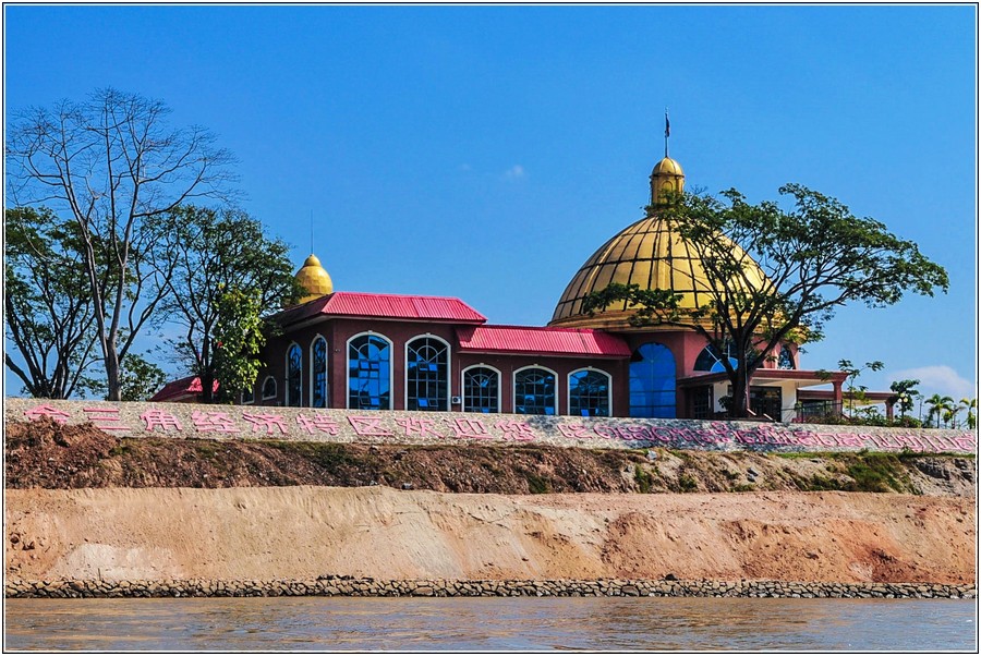 座落湄公河畔一座寺廟正面看起來只是一般寺廟,在河面觀看寺廟的側面呈現釋迦牟尼佛搭乘一艘豪華遊艇下凡解救眾生!