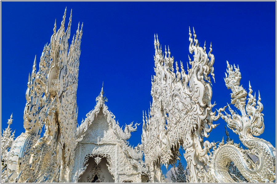 清萊內的白龍寺,是世界上又一個獨一無二的寺廟。全寺白色,雕有無數條龍,還有各種華麗造型,並且在這些圖案中鍍有銀色的金屬條帶,從合適的角度看上去,就像是全院散發著令人驚異的魔法之光。