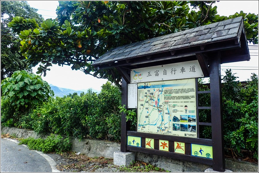 玉富自行車道看得到卻找不到入口,經詢問路邊店家,老闆娘很熱心的放下手邊工作比劃著說有二個入口,一個在玉里火車站旁邊,一個是在玉里大橋還沒上橋的右手邊小岔路。原來是沒有指標,而且看板位在岔路裡頭所以剛才眼濁沒看到。