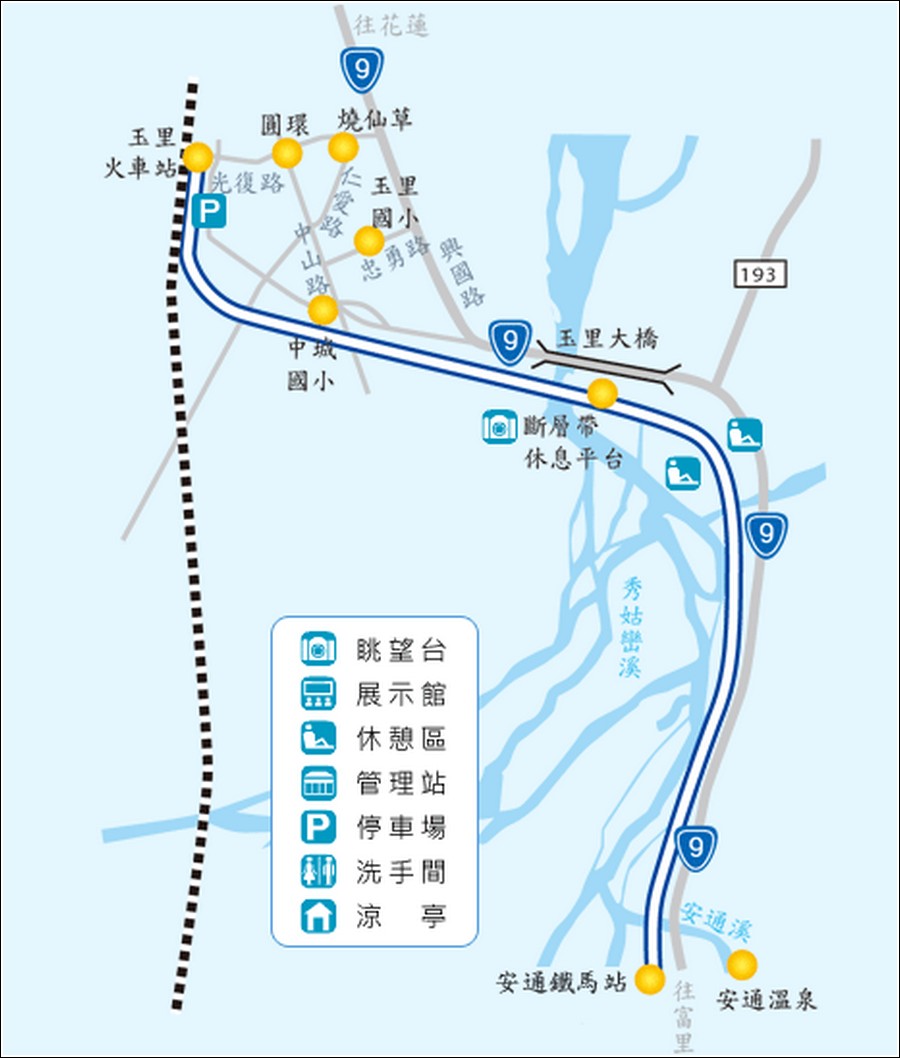捷安特環島團因為參加的是逆時針團,是從東里鐵馬驛站往北騎,還沒過秀姑巒溪時就離開自行車道接193縣道往大農大富公園,所以老狼也沒搞清楚玉里那一段要從哪裡接上自行車道,現在明白啦。