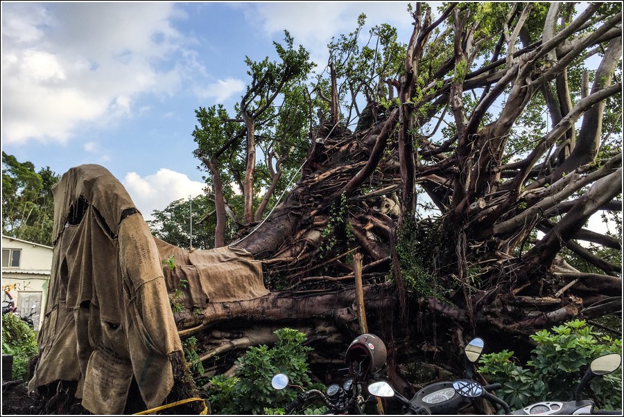 離開淡水,騎淡水、關渡自行車步道,一棵古榕樹被蘇勒迪颱風吹倒,至今尚未救援回復,可惜!