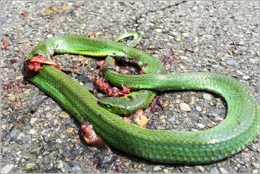 阿良萎,一尾小青蛇被碾爆,老狼找了一根樹枝把牠移到馬路之外的野地,不想讓牠繼續被折磨,郭杯幫忙禱告:「塵歸塵、土歸土!」