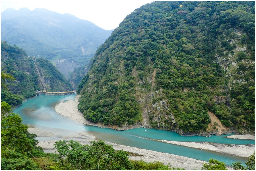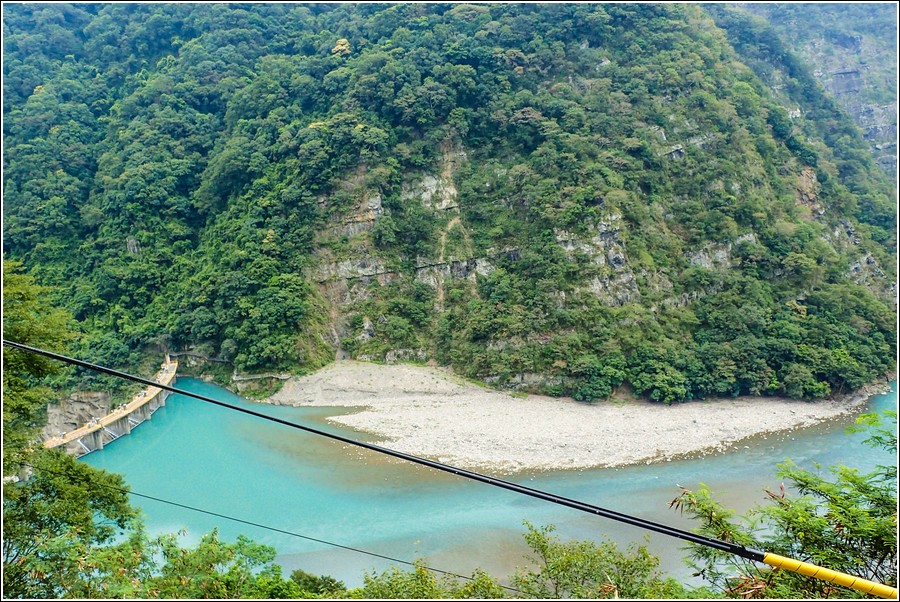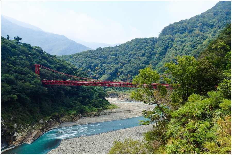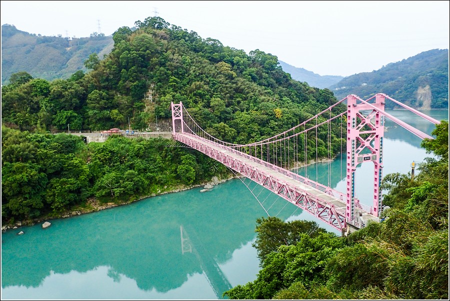 羅浮橋上欣賞復興吊橋風光,粉紅絲帶依山傍水婀娜動人。