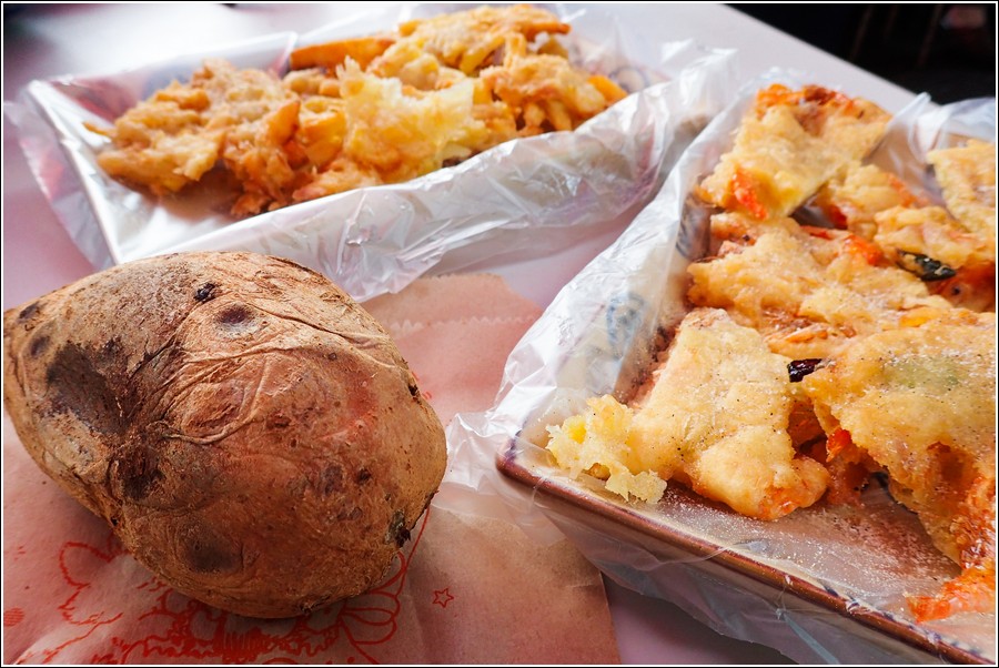 在巴陵大橋周邊小吃攤休息一下,點了炸地瓜餅50元、炸蝦餅50元、烤地瓜30元、一瓶水20元、一瓶舒跑30元。