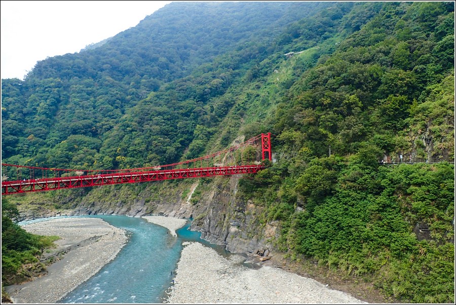 豔紅色羅浮橋高姿態橫跨大漢溪。