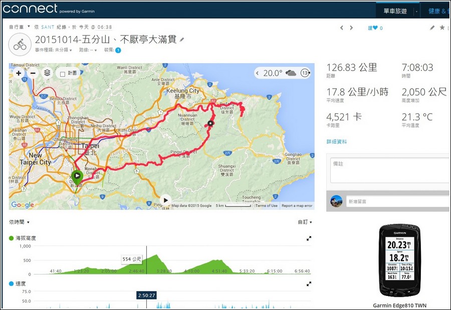 本來只想騎公路車去雙溪溜溜,來回104K,所以只有輕裝,清晨6點半出門。後來發現從十分可以繞去五分山,於是加碼五分山,輕鬆騎上五分山朋友推薦騎不厭亭,來個五分不厭大滿貫,查閱Google map五分山到不厭亭只要25K,於是再加碼不厭亭。九份上不厭亭果然風景ㄅ棒,10~13%陡坡不難挑戰。問題是一路逗留,下午3點多才抵達不厭亭,已經騎了73K該怎麼回家,今天本來沒打算騎長途,手機、Garmin EDGE 810已經電力不足,頭燈電力也撐不住,沒把握沿102縣道溜到雙溪,經2丙省道、北42縣道、坪林回家(將近80K山路),從Google map查詢最快、最短、最沒坡度的路線是原路下溜到瑞芳,接八堵騎台5線找到台北市八德路、基隆路就能脫困了,哈哈,五分山、不厭亭大滿貫好吃、好玩,值得再挑戰!