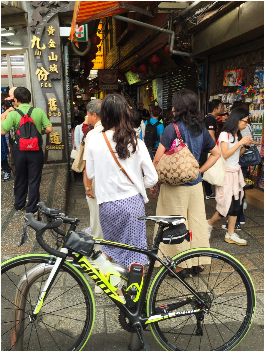 爬九份坡道,最大坡度9~11%,雖然非假日人車很多,一直被車輛擠到鑽不過去!