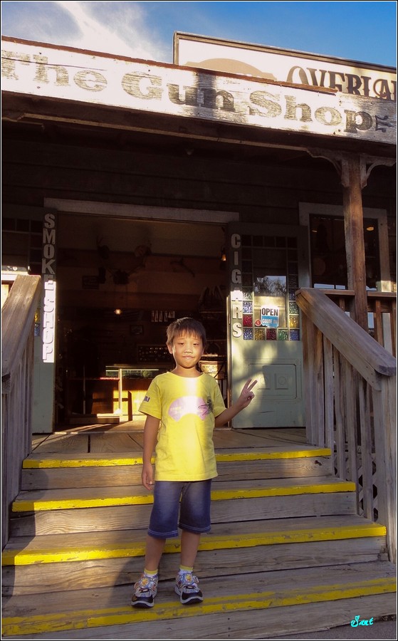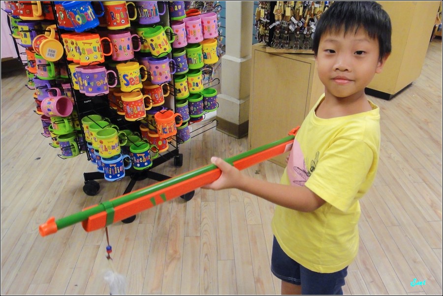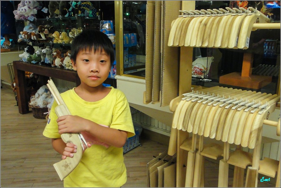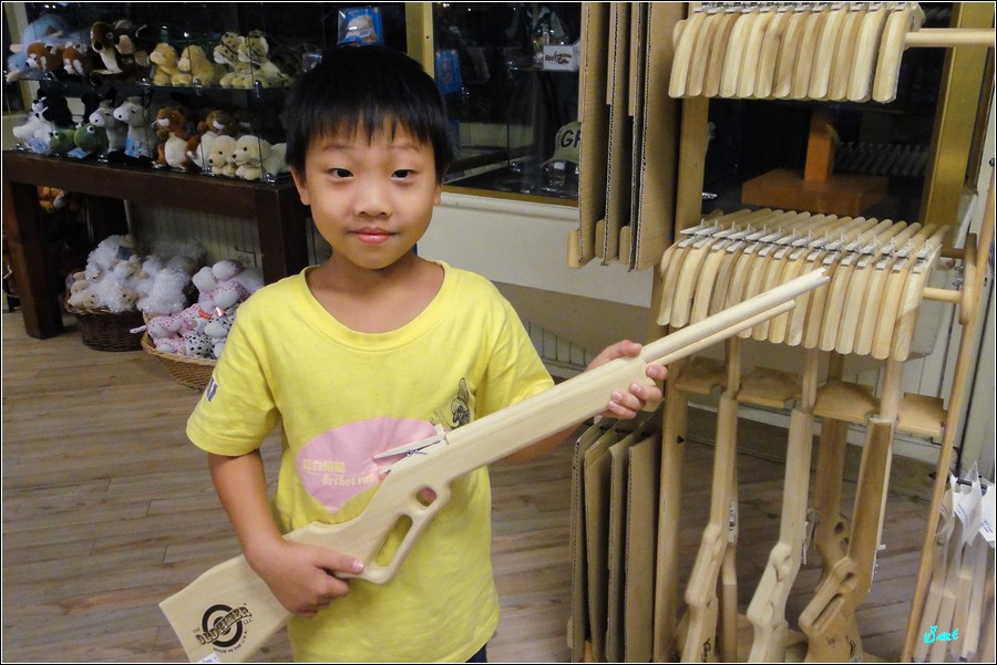 眾多紀念品店,小狼唯獨對這些多款槍枝有興趣,請我幫他跟每一種玩具槍都合照一張當紀念。