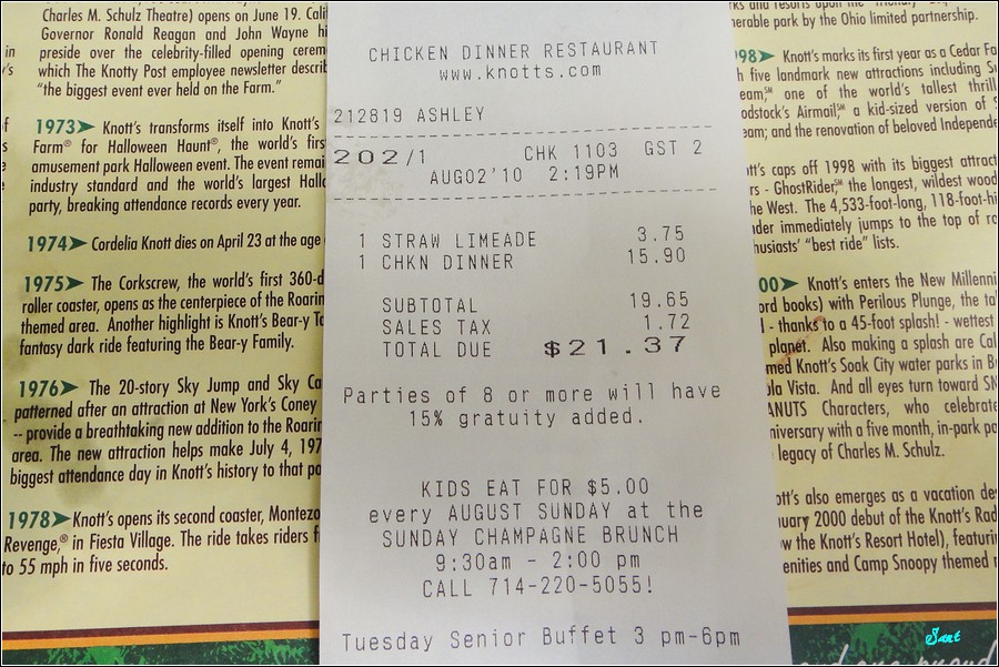 話說Knott’s諾氏夫婦1920在洛杉磯的荒郊野外種草莓,製作美味草莓醬讓老美瘋狂搶購,天天大排長龍。我們中午就去諾氏Chicken Dinner Restaurant啃雞腿,實地了解為何Knott’s Chicken讓老美為之瘋狂。