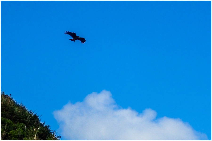 一隻凶猛黑鳶在狼頭上盤旋,突然俯衝而下捕獵小鳥,速度太快,老狼的傻瓜相機沒捕捉到畫面,那隻倒楣小鳥唧唧唧亂竄,就在撞擊地球前的一剎那急轉彎,老鷹雖然速度更快,奈何不了地心引力提早轉彎,就醬子失去了美味一餐。