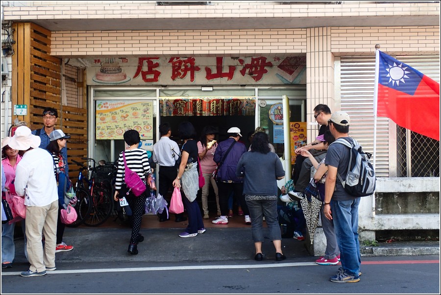 一群登山客把雙溪區中華路2號『海山餅店』擠爆了,據說海山餅店的寒天布丁蛋糕是招牌熱賣品,熱情的登山客招呼老狼也進去湊熱鬧,老狼:「你們一大群,我要排到天黑。」