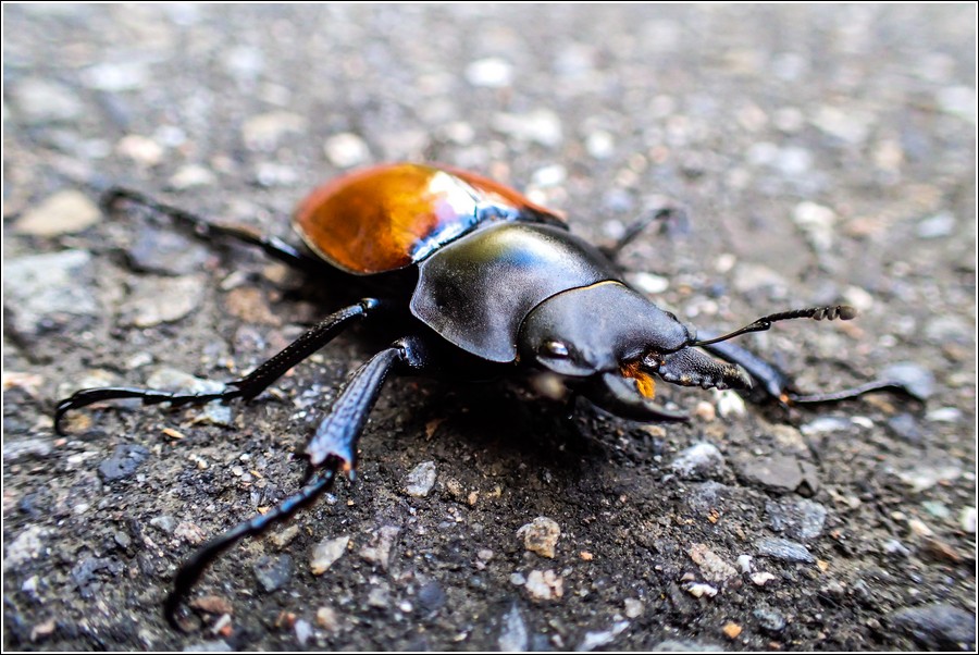 鍬形蟲頑皮的跑到馬路上,幫牠送回路旁草叢裡。