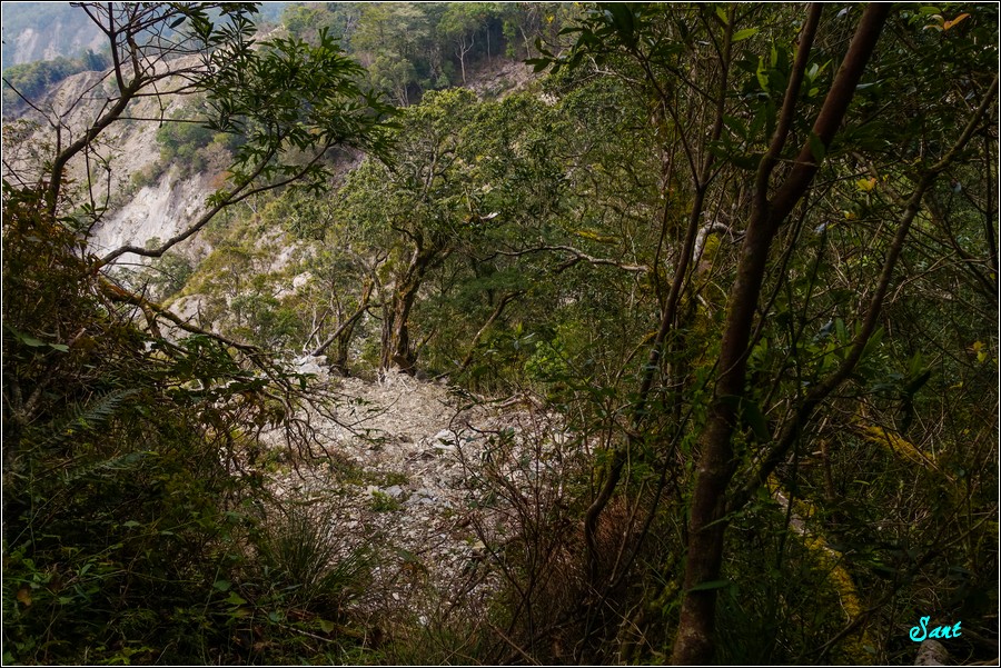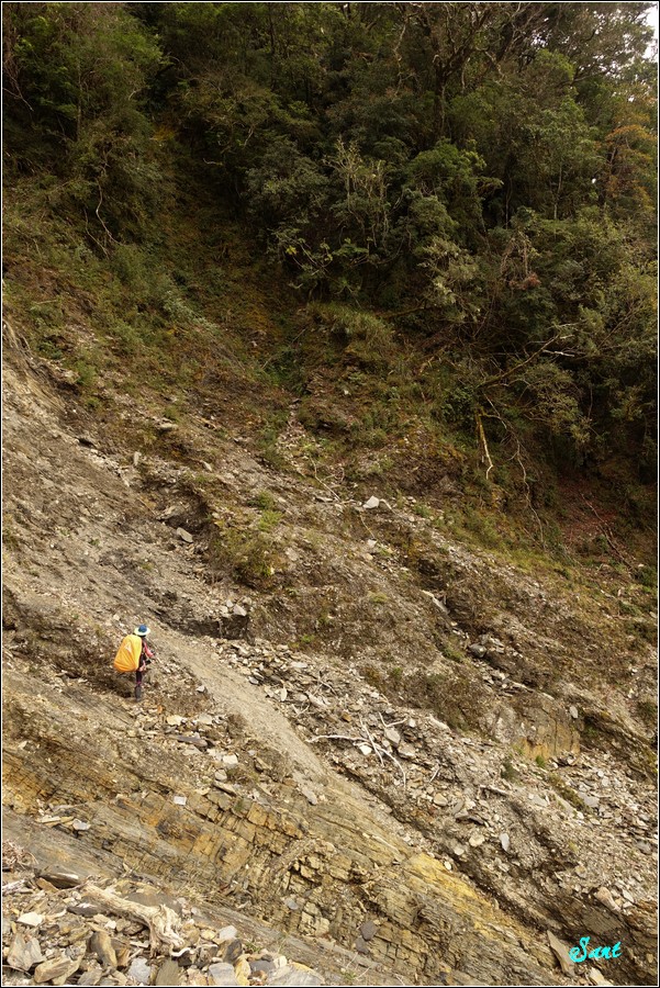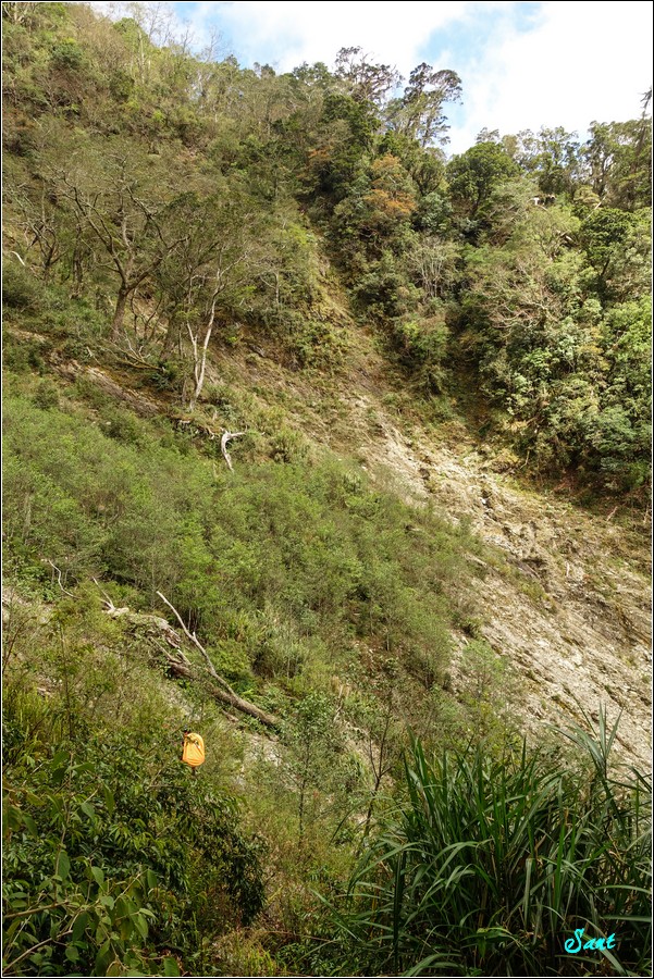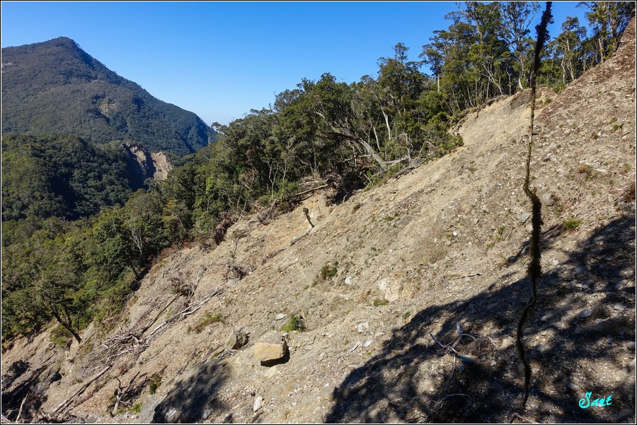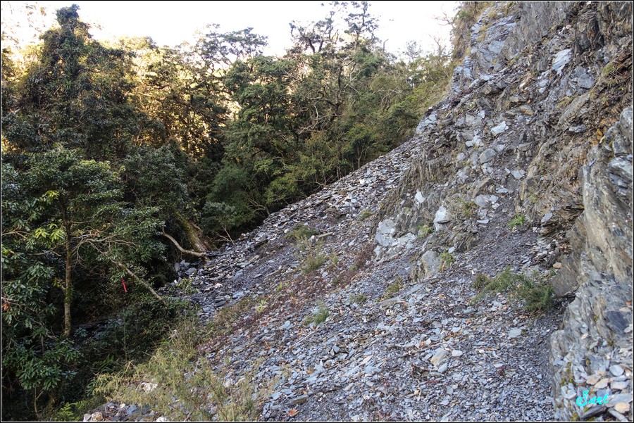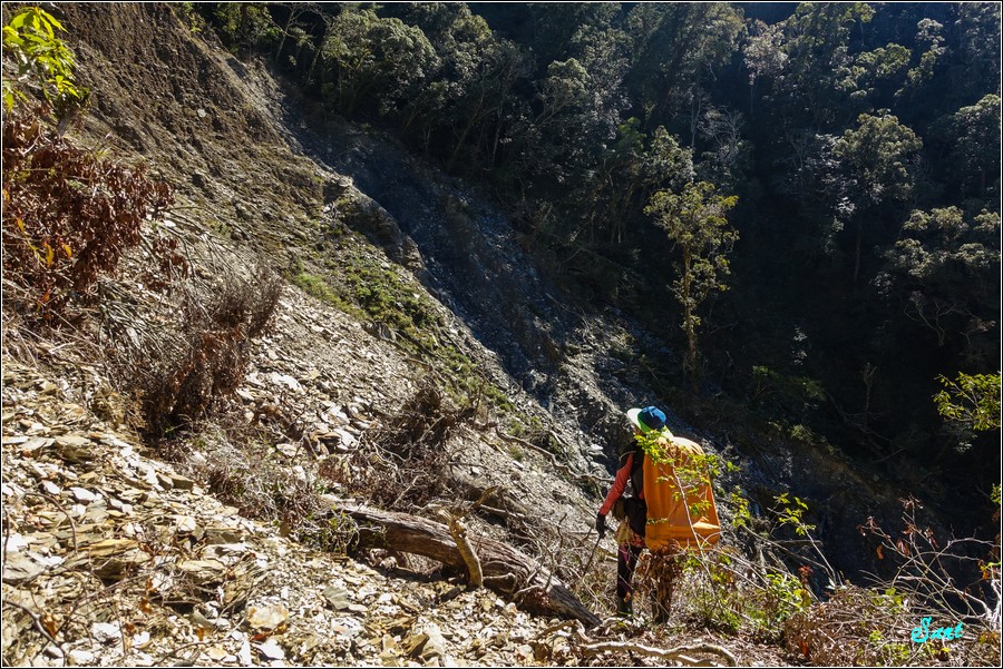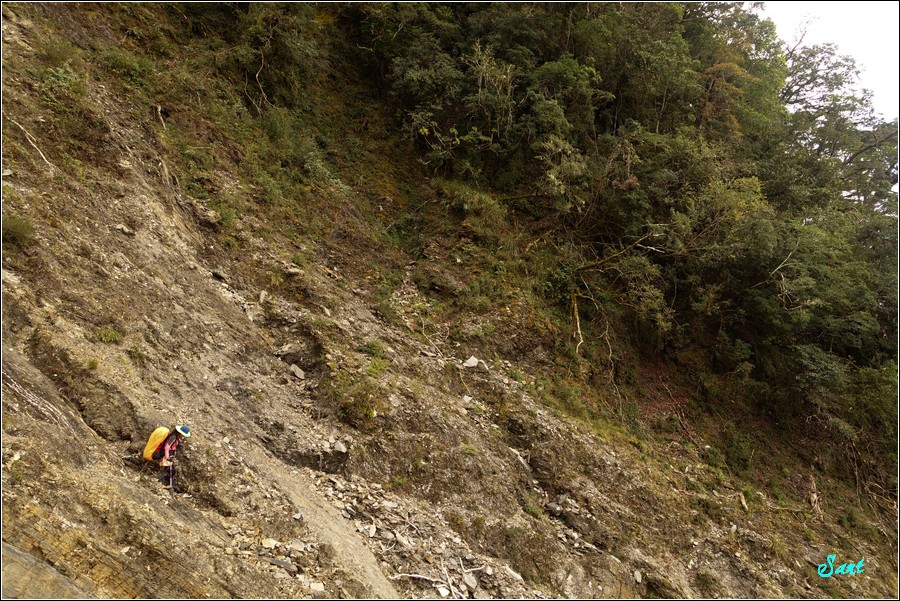 11:10 終於出現出發前觀看MIT台灣誌裡頭驚險的路徑,這原本是寬廣的多納林道,路徑坍塌,林道只剩下邊緣一點點,狹窄處容不下一腳掌寬,甚至已經完全裸空,必須先將身體、背包傾向山壁,大步跨過去。這一段當然不是驚險處,因為驚險處哪敢拎相機拍照。