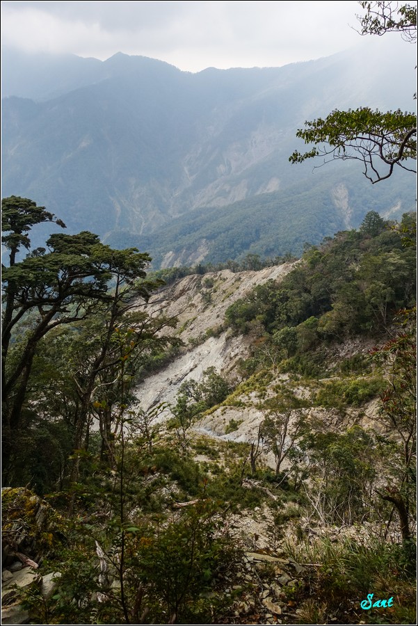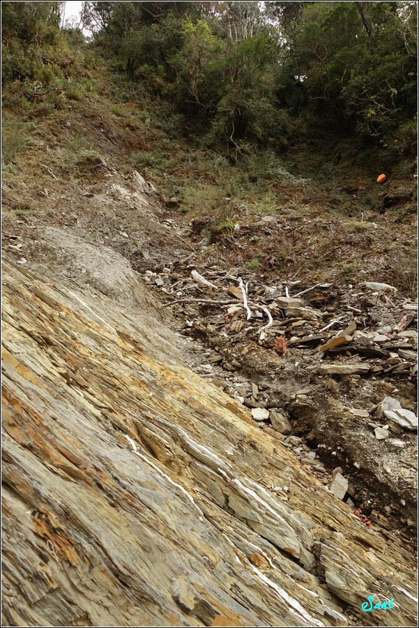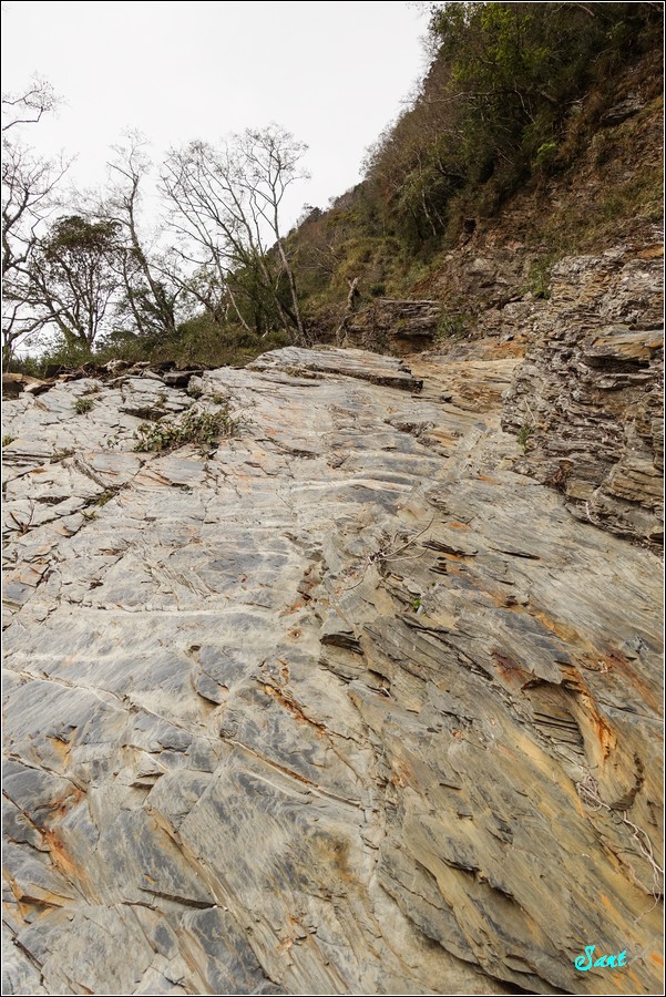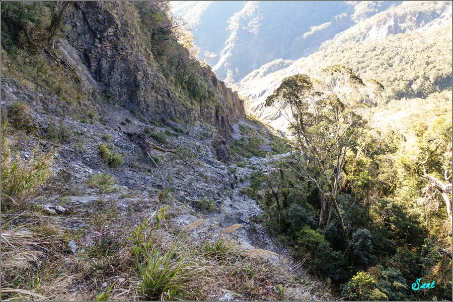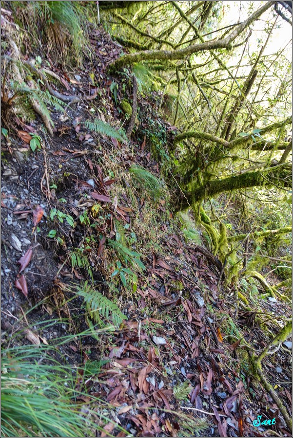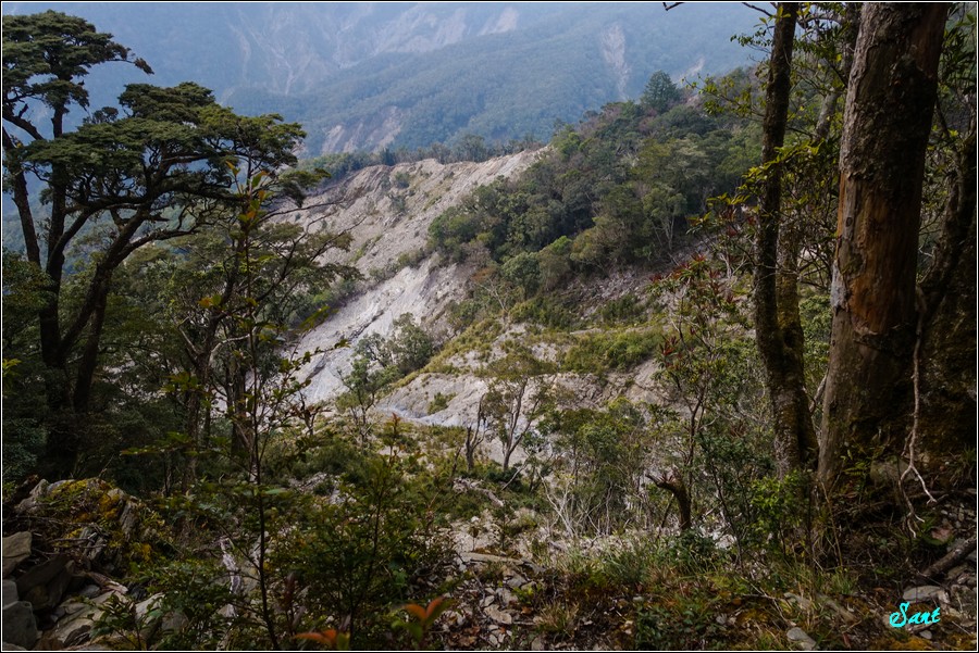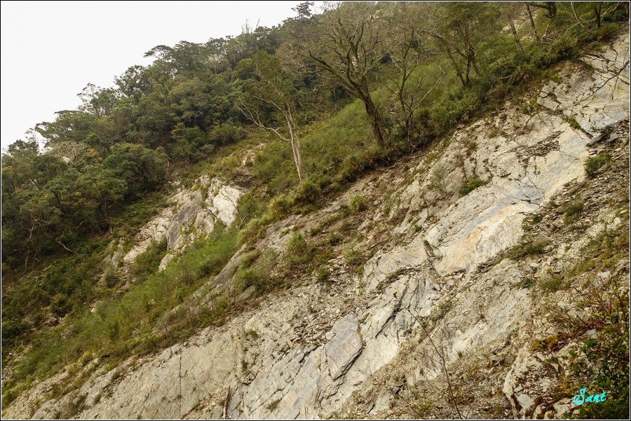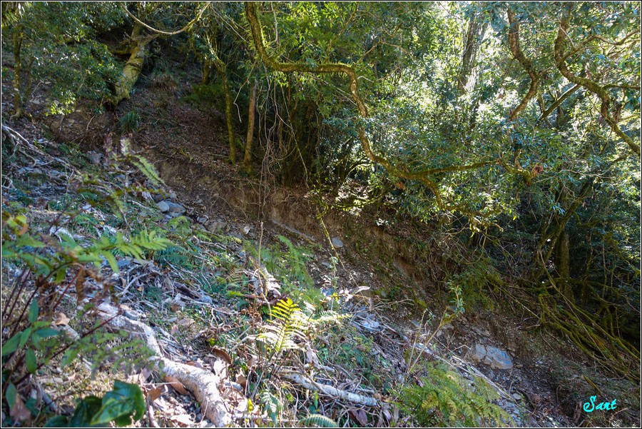 11:10 終於出現出發前觀看MIT台灣誌裡頭驚險的路徑,這原本是寬廣的多納林道,路徑坍塌,林道只剩下邊緣一點點,狹窄處容不下一腳掌寬,甚至已經完全裸空,必須先將身體、背包傾向山壁,大步跨過去。這一段當然不是驚險處,因為驚險處哪敢拎相機拍照。