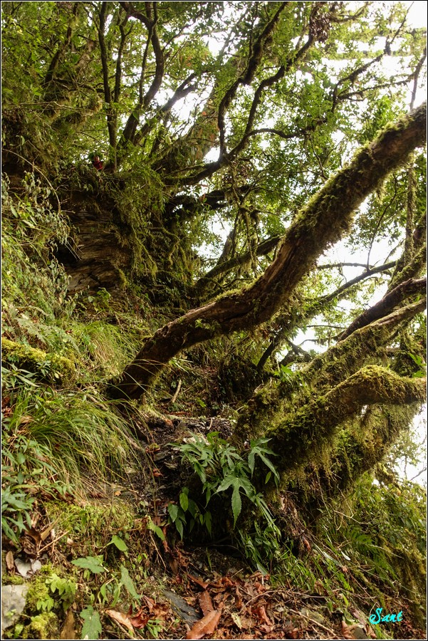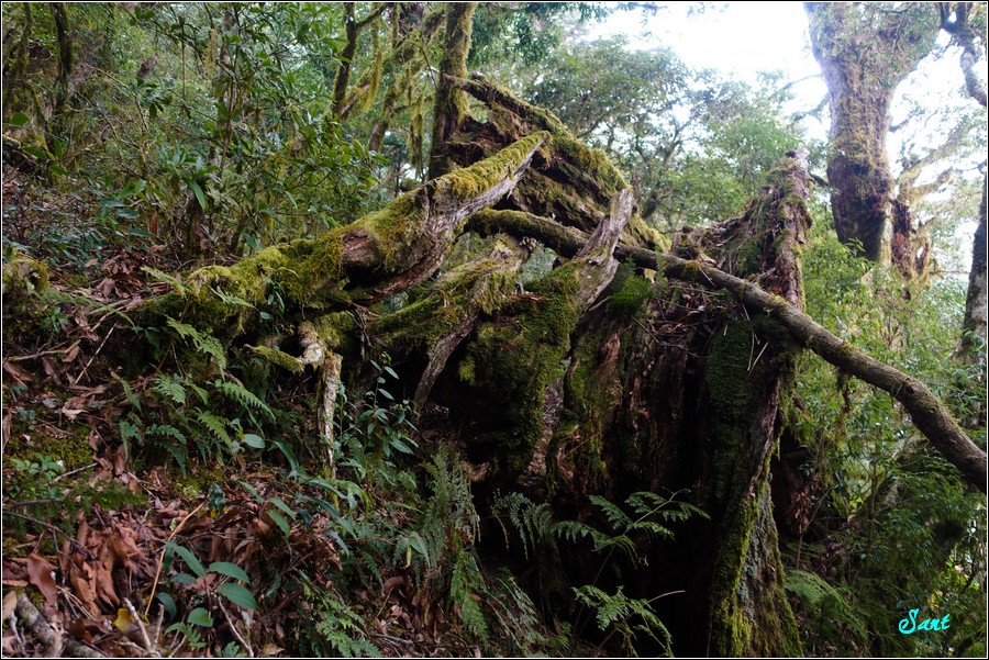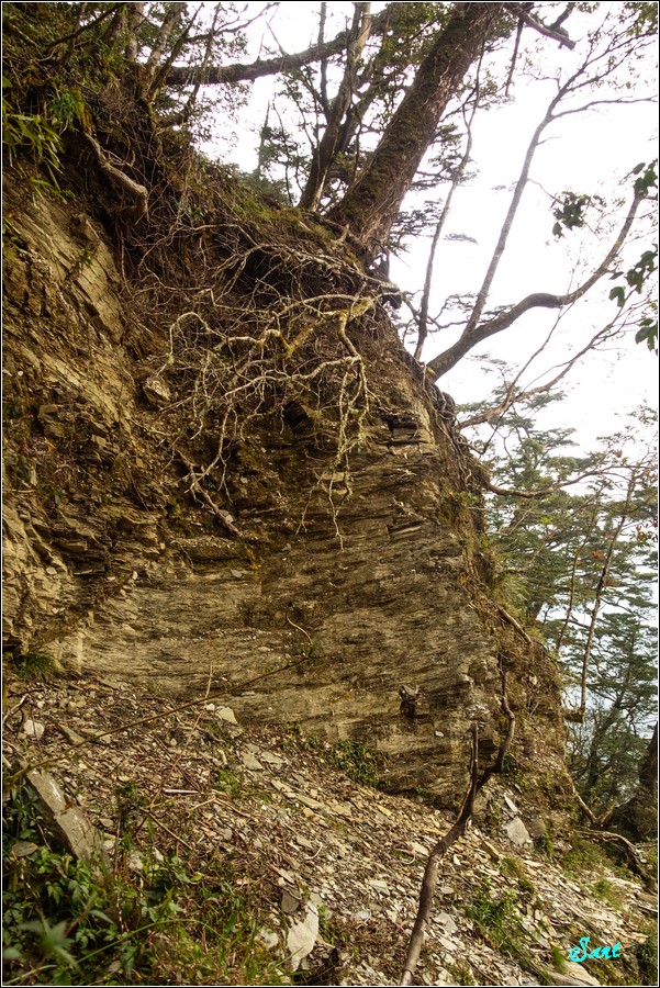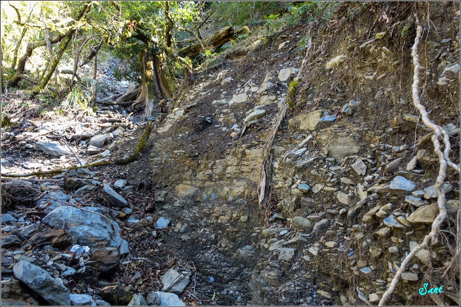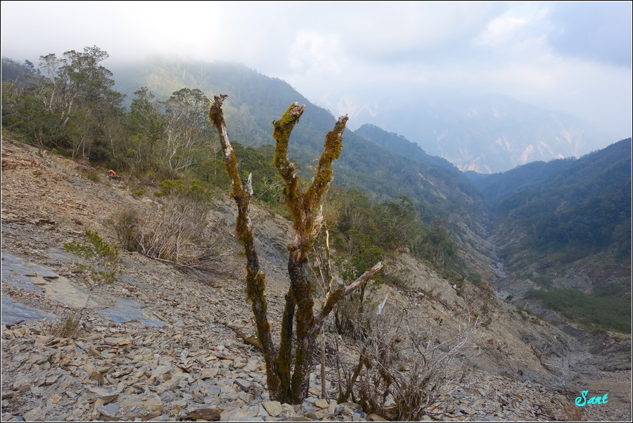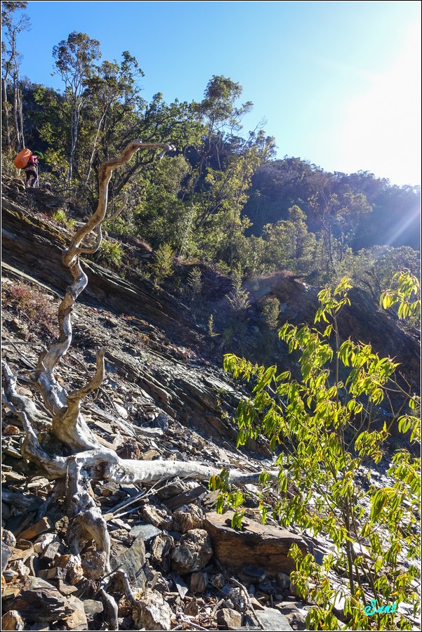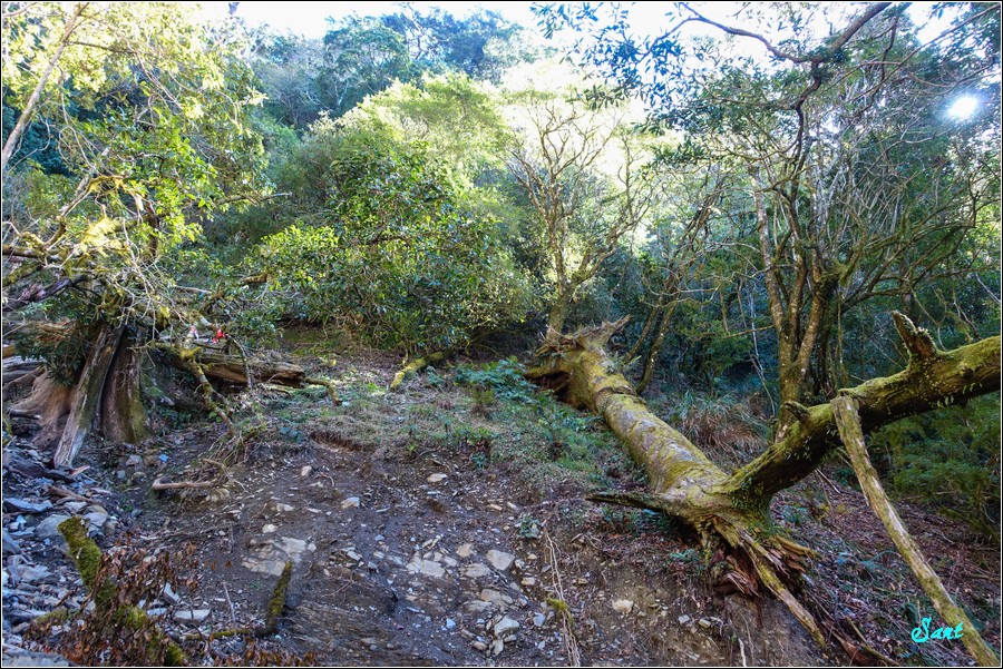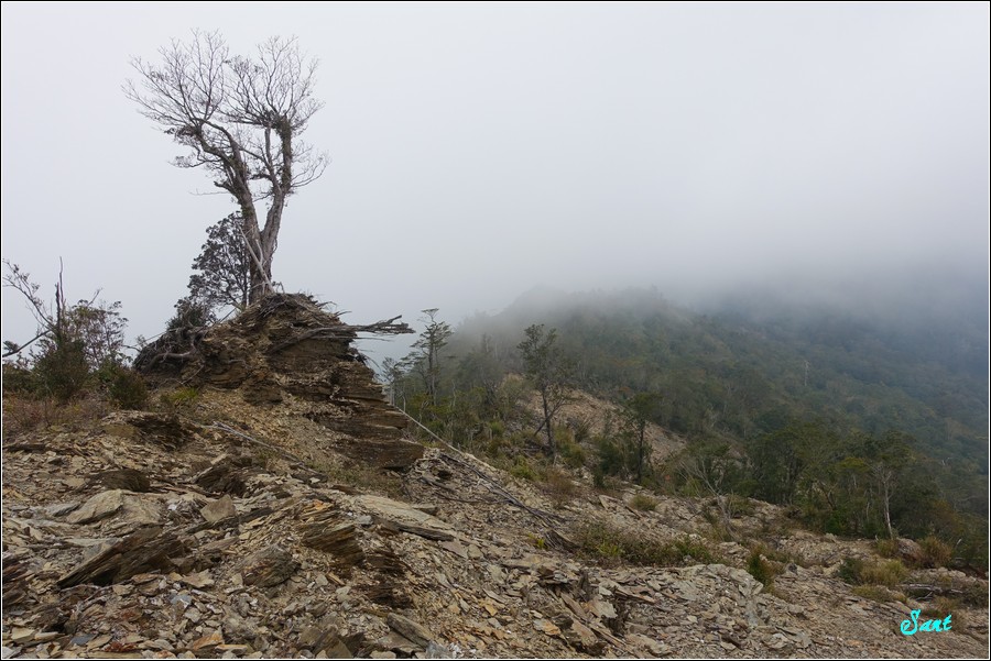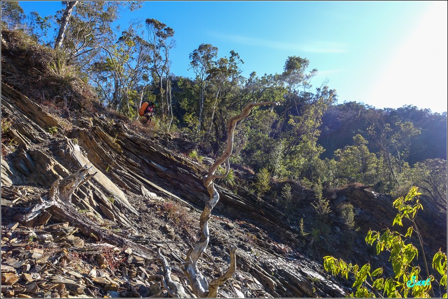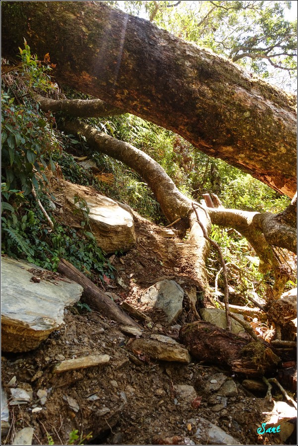 Gigi手指右前方一棵斷裂的巨大神木樹根:「那就是大樹洞,曾經有山友下雨臨時破降在裡頭過夜,往前下溪溝就能找到水源,是活水,你先回營地吧。」