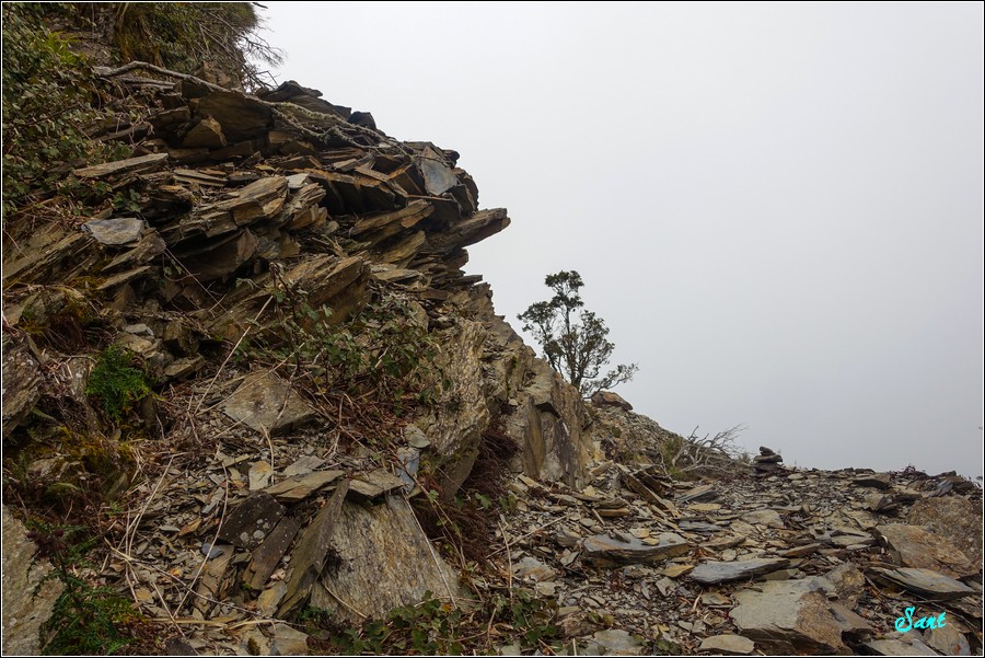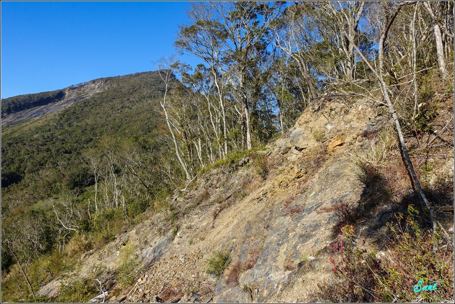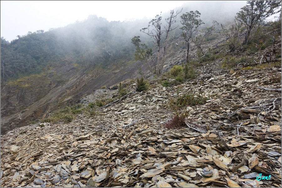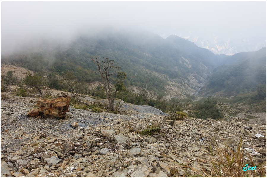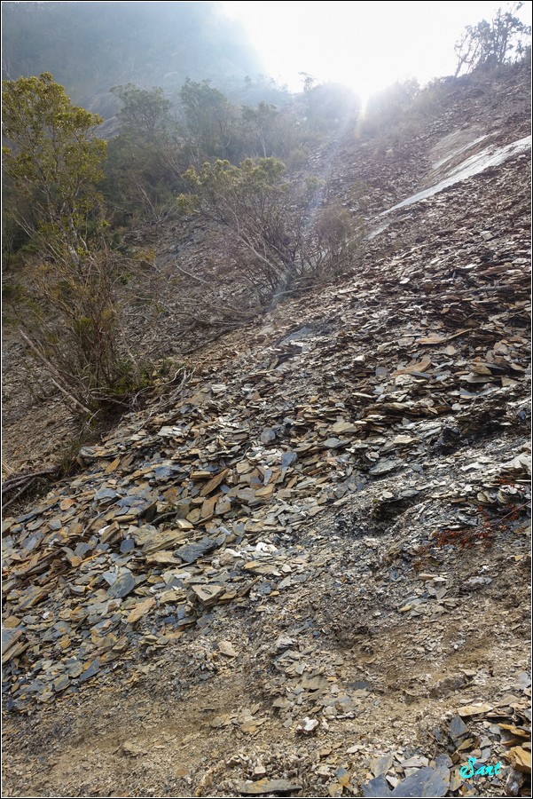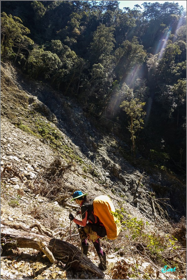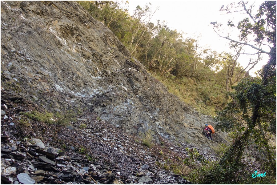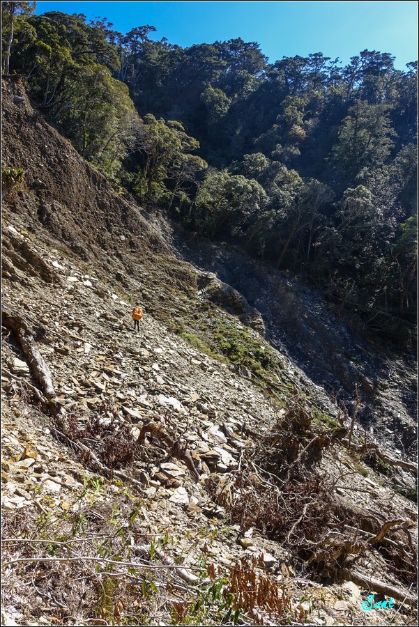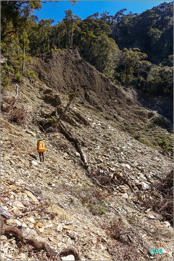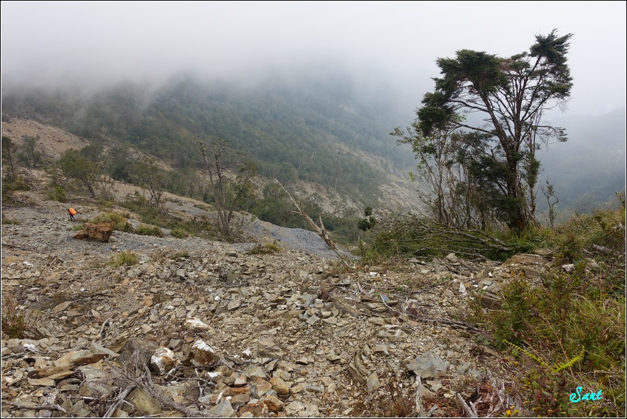 看不到對面有沒有布條,路徑也不清晰,碎石坡很陡很碎裂,該怎麼踏出下一步讓Gigi一度猶豫中。