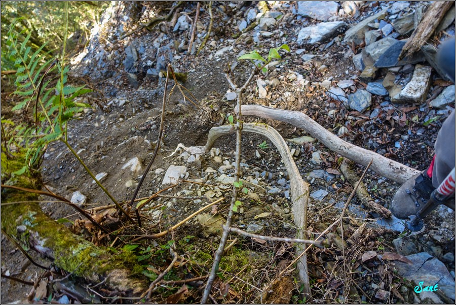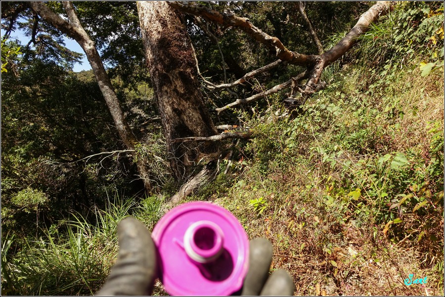 鑽過倒木之後撿到這個粉紅色塑膠蓋,不知道是神馬玩意,還滿乾淨、帶有幾滴水珠,很可能是Gigi掉落的,幫忙揀一下,不是Gigi的就把這個塑膠垃圾背下山。