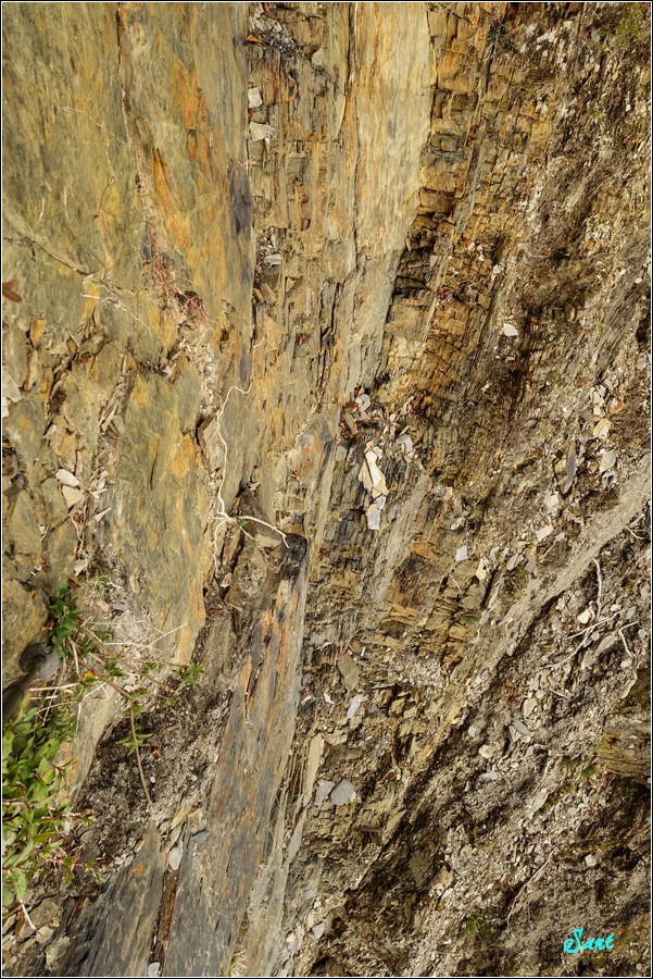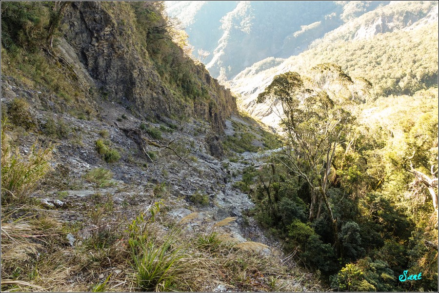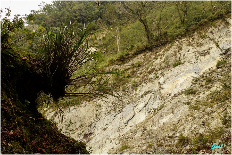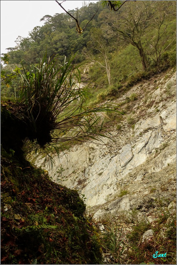 將身體跟背包倚靠山壁之後嘗試抓一些草當支撐,小時候經常幫阮阿母拔雞毛(當然不敢幫公雞、母雞脖子劃刀放血),這些山壁上的小草就像放血後淋上滾水後的雞毛,拔一搓掉一搓。