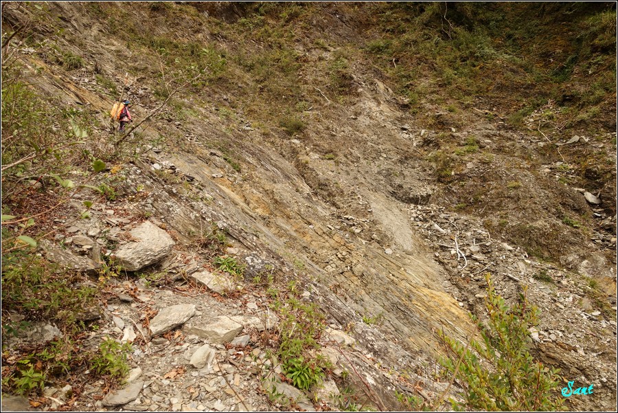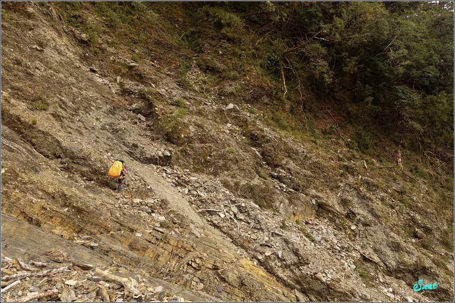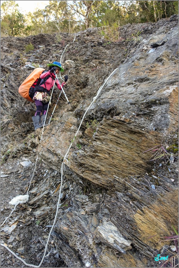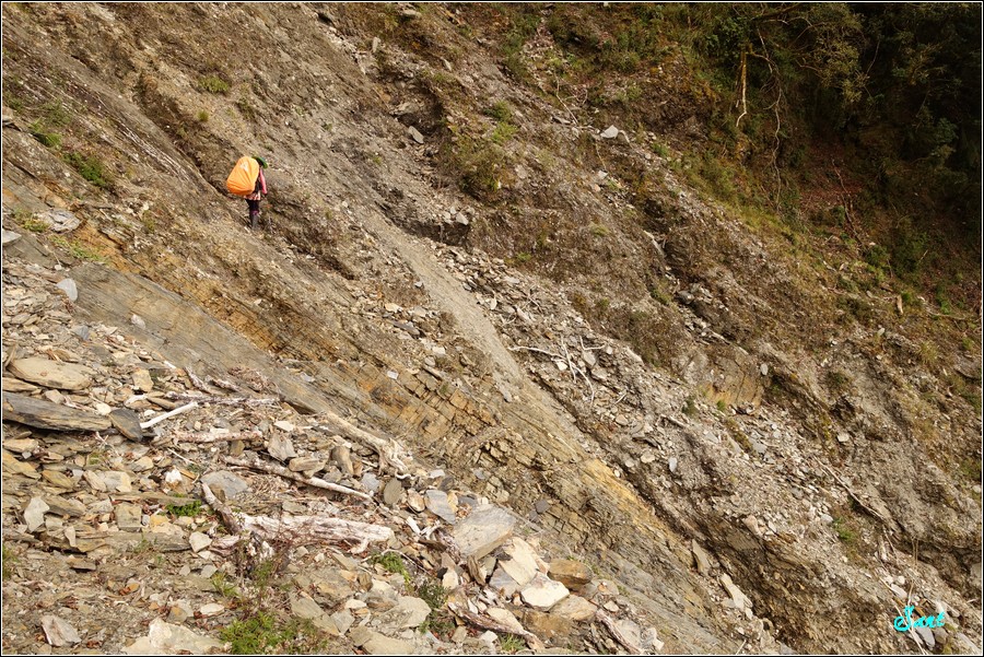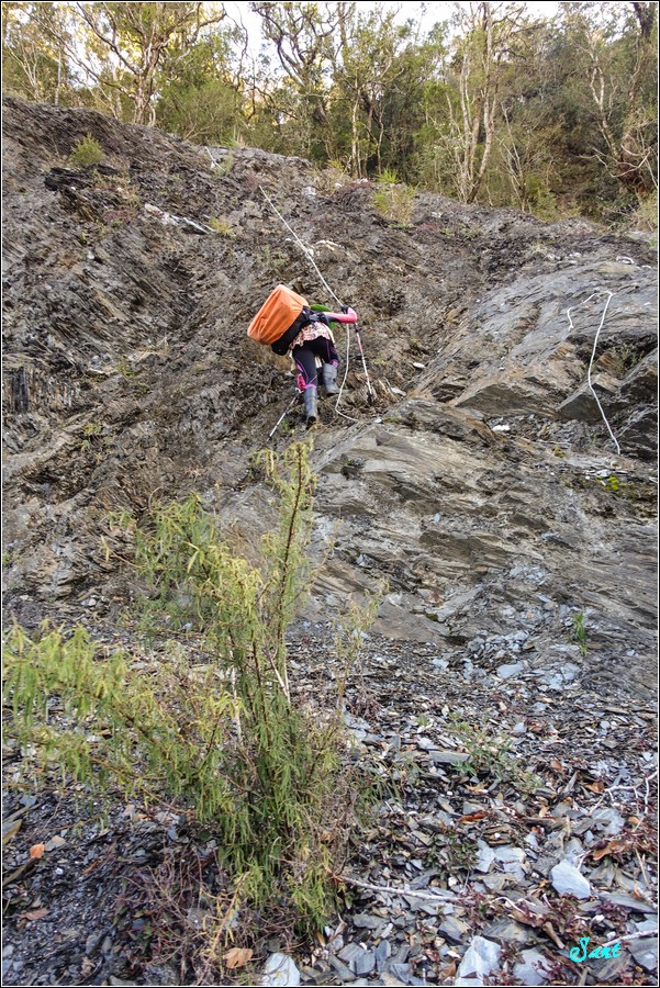 Gigi:「你只能將背包跟身體的重心移到山壁,嘗試自己找踏點,山壁上能抓得到的草都是支撐。不能太用力踩踏點,山壁是鬆的。」