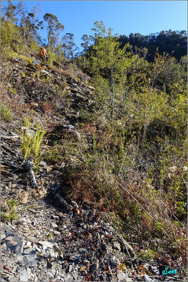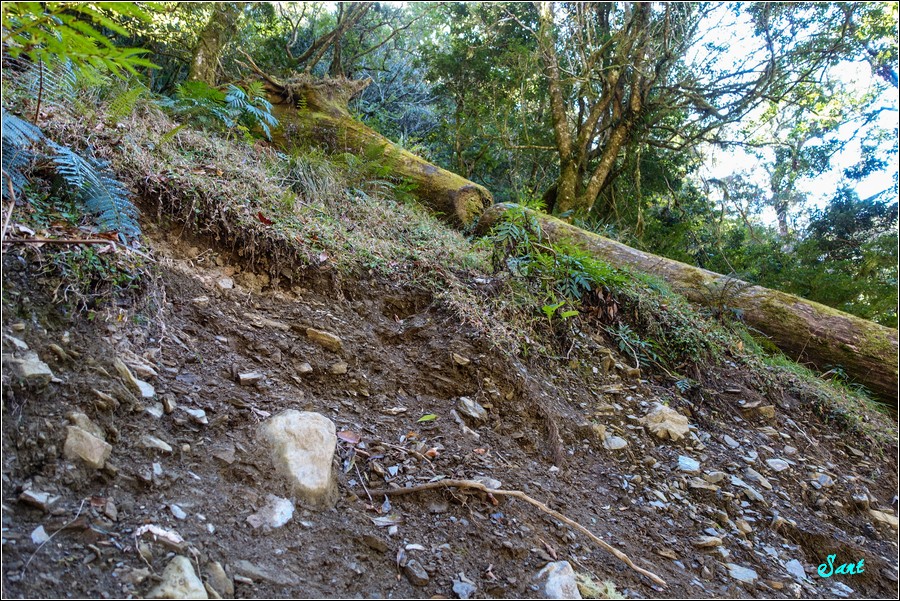 06:52 崩塌的太嚴重,連上個月剛走過的Gigi也不時得靠GPS確認是否偏離走過的路徑,趁她還在研判GPS路線,老狼在Gigi上頭等待中。