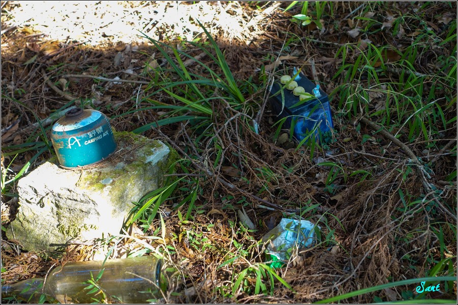 09:56 小營地旁遺留獵人的酒瓶、瓦斯罐、摩托車電瓶等垃圾,這些垃圾不會是登山客背上山所棄置的。