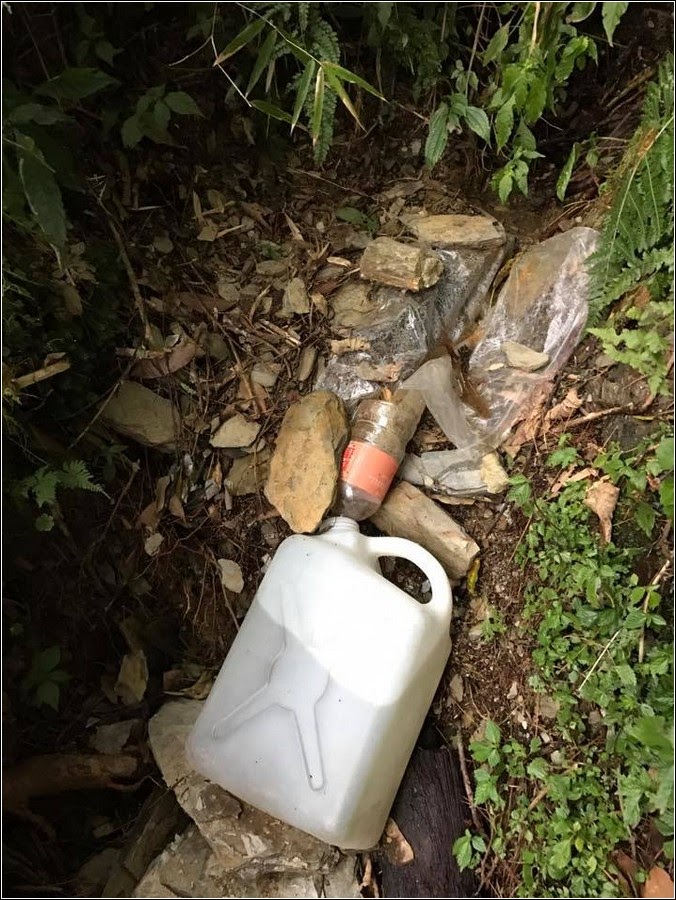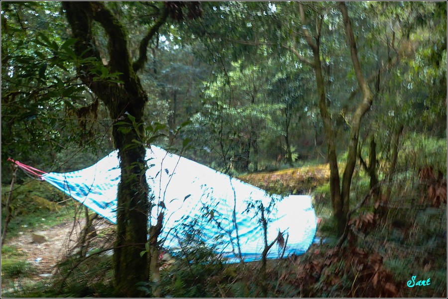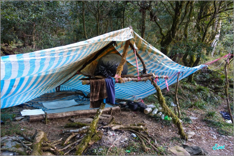 第二天晚上摸黑,也是在這個位置休息5分鐘,只知道獵人營地就在路徑附近,當時四周什麼地形地貌根本看不到,一片黑,原來獵人營地就在路徑下方20米處。