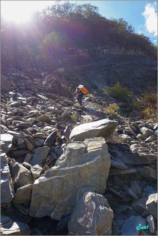 偶的老天鵝啊,這道崩塌就是第二天讓老狼刁上光滑頁岩上進退不得,差點放棄前進,被迫自己撤退的索命關。