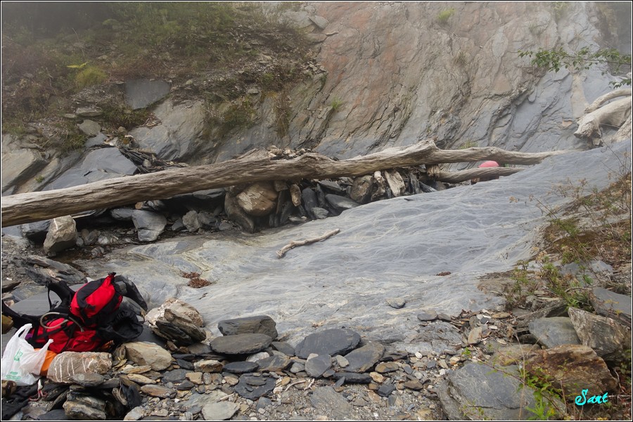 第二天,Gigi在這裡等老狼等的不耐煩,乾脆在這裡取水3公升,早知道就在第一水源處(第一天午餐處)取水,就不會發生那天晚上下乾溪溝取水發生的濃霧中摸黑鬼打牆、在大石塊上摔落、在黑霧中找不到路的恐怖事件。