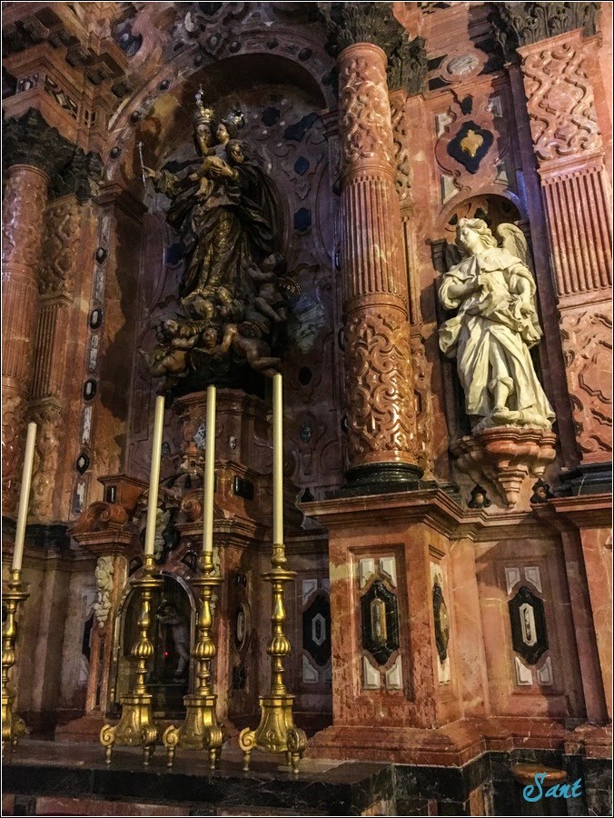 銀壇中央是聖母、聖嬰雕像,前方三個王室骨灰銀盒,中間一個是費爾南多三世,左右二個是皇后跟兒子阿方索十世。