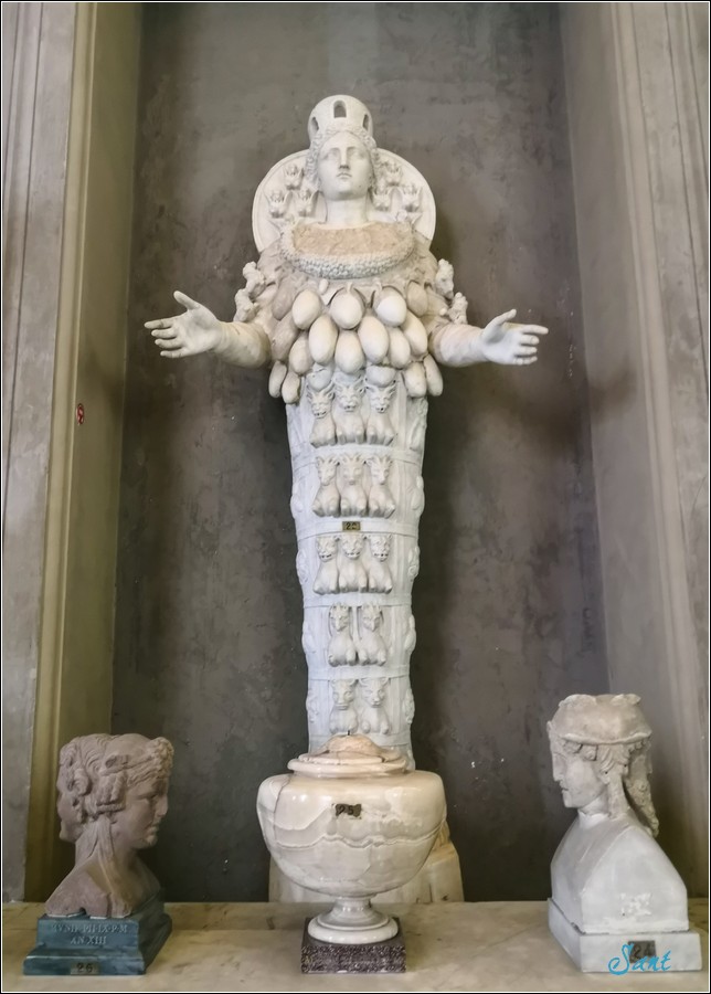 老狼在網路找到一位老外部落客敘述這尊雕像:「我們在梵蒂岡博物館的導遊說,這個古老的生育女神裝飾著牛睾丸。(Our guide in the Vatican Museum said this ancient goddess of fertility is decorated with bull testicles)」