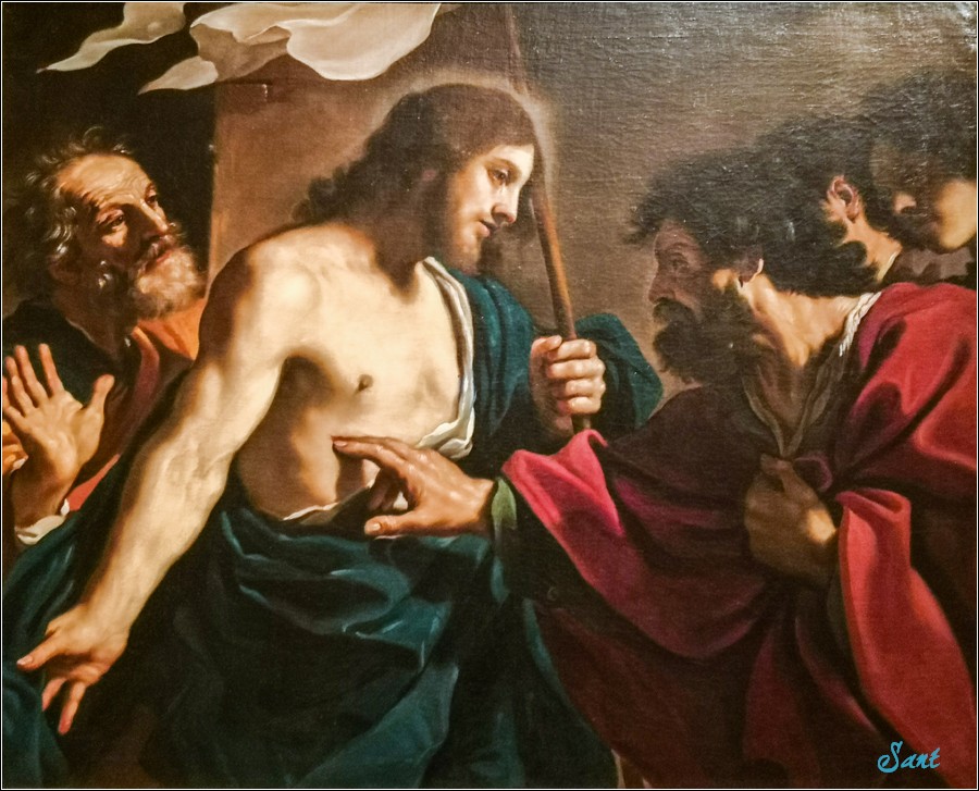 那天晚上,耶穌在一個鎖著的房間裡出現在他們中間,並賦予他們超越罪和赦免罪的權力。一周後,托馬斯並不相信耶穌能死而復活並產生懷疑,耶穌叫托馬斯用手探觸耶穌胸口上的傷口,托馬斯驚訝的說:「我的主和我的上帝!」
