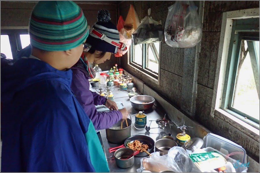 前天在五岩峰遇上午後雷陣雨,二隻狼來不及穿雨褲(老狼是忘了將雨褲塞背包哪個位置),褲子、襪子、登山鞋全濕,所以她這二天在南湖山屋都忙著幫二隻狼烘襪子、長袖排汗衣、鞋墊、登山鞋。很忙!