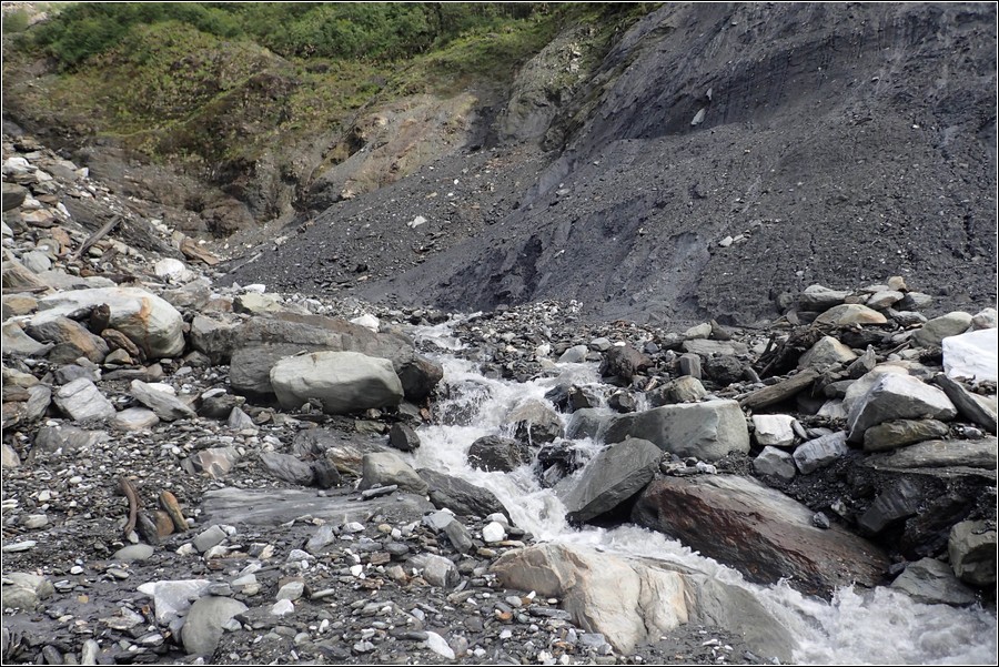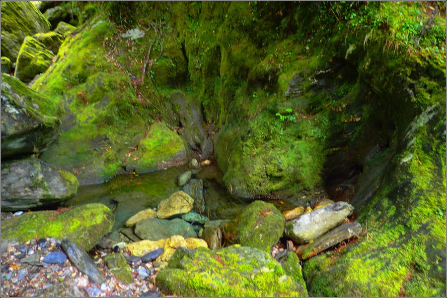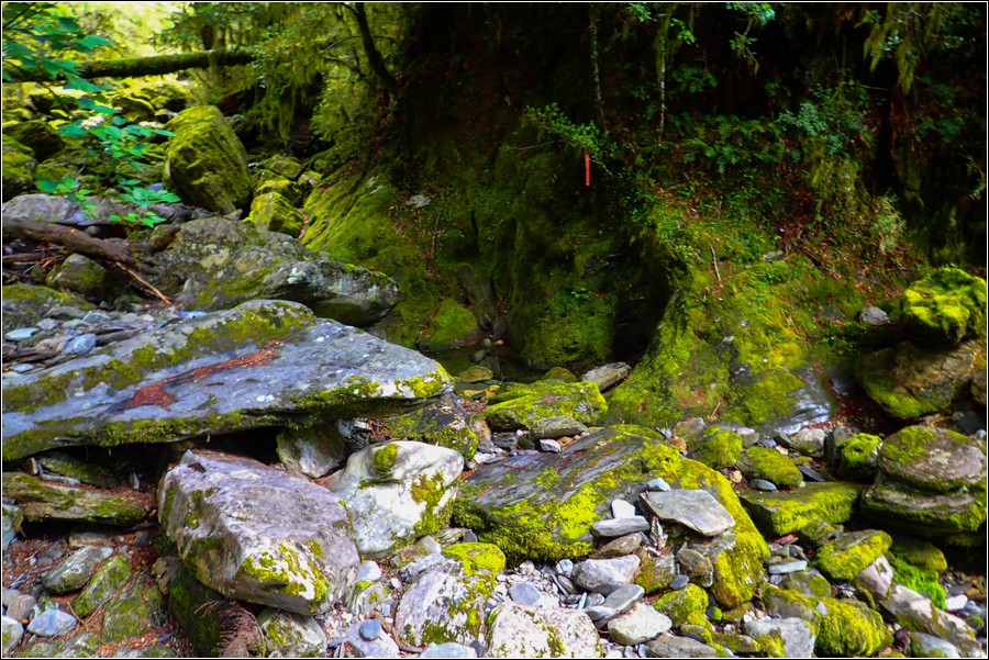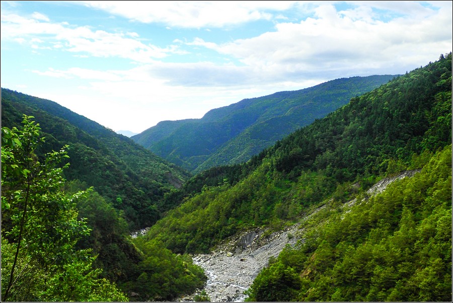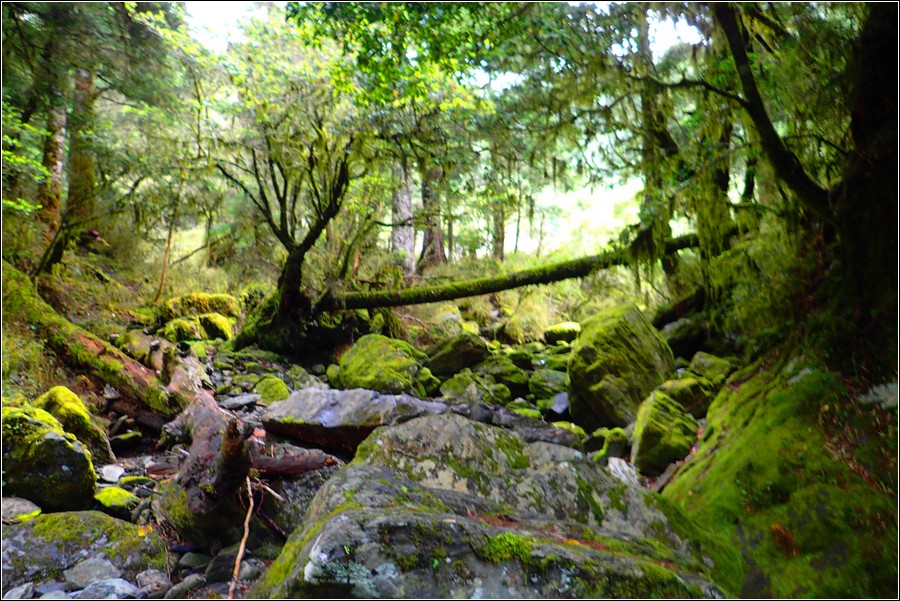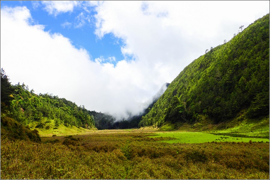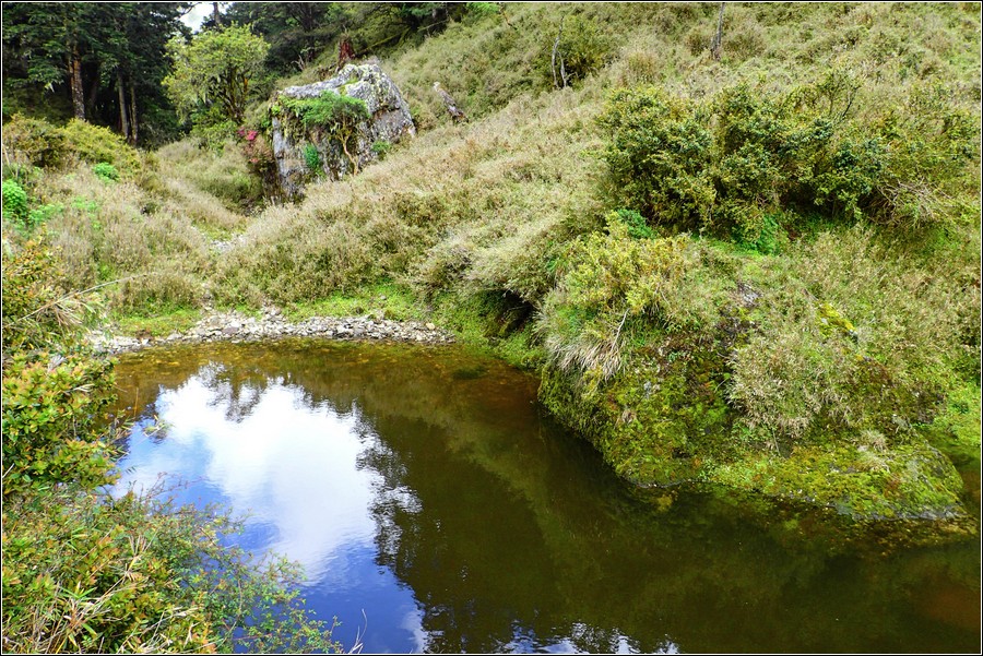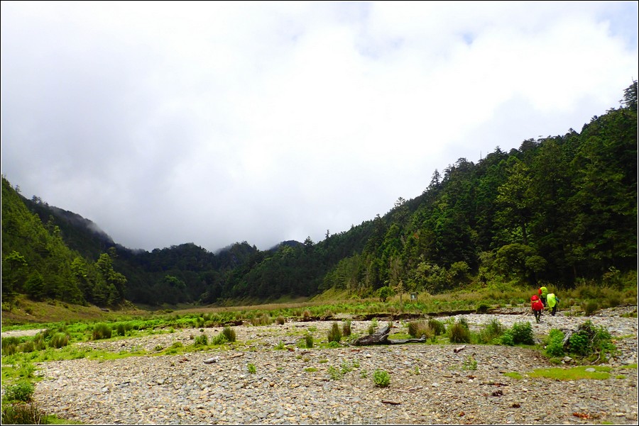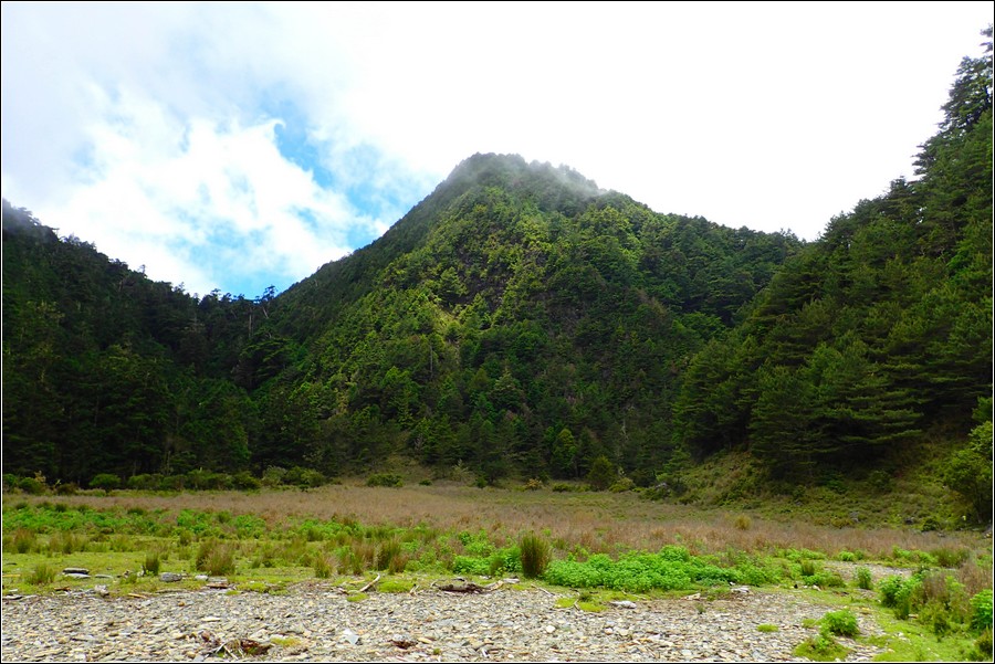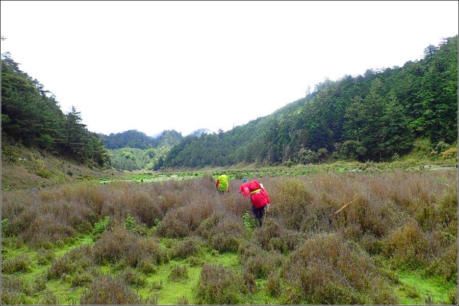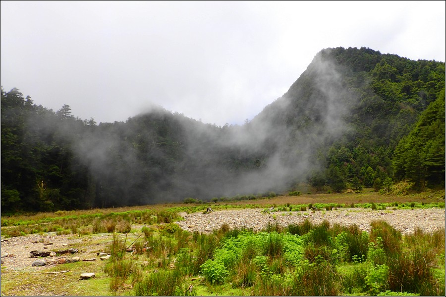 豐坪溪主要發源於丹大山與馬博拉斯山之間,源頭頗多,南支流在上面4張照片峽谷之後來到這片略成西南朝東北縱向廣大的谷地形產生伏流現象,地表的玉山箭竹是水鹿的最愛。