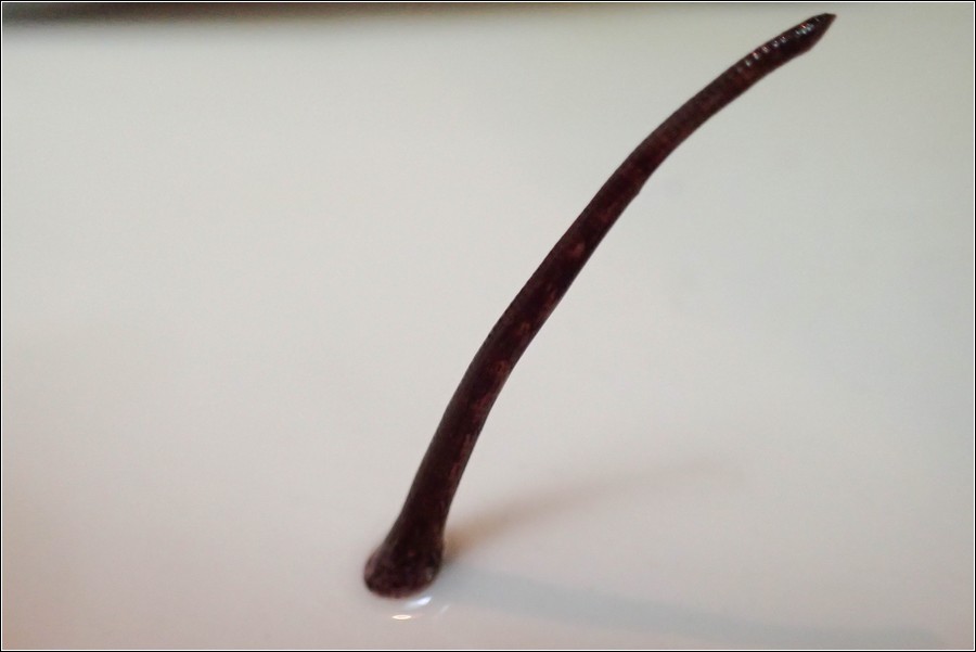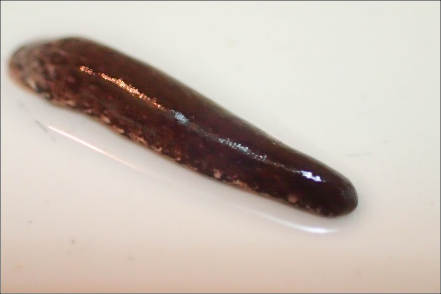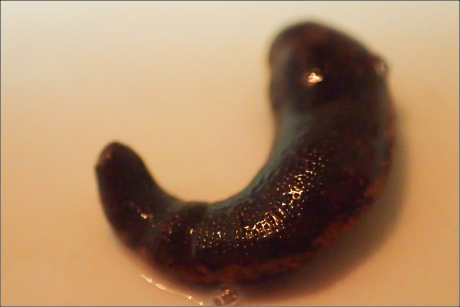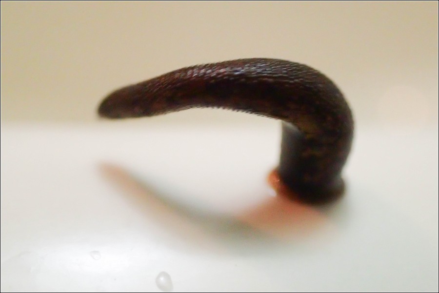 小紅帽每一趟高山行程結束都是老狼幫她清洗裝備(所以不要碎碎唸老狼一到山屋就擺爛啥麼事情都不做)。這天,幫小紅帽善後,在背包套想撥掉一支黏在上頭的枯枝,挖靠北,嚇死老狼,牠不是枯枝,是一隻螞蟥!