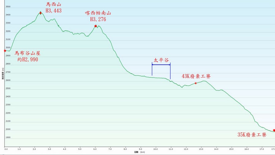 行程:馬布谷屋→馬西山(輕裝來回)→喀西帕南山→太平谷→中平林道→35K廢棄工寮