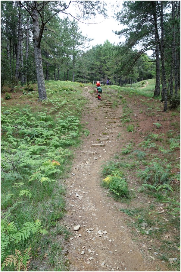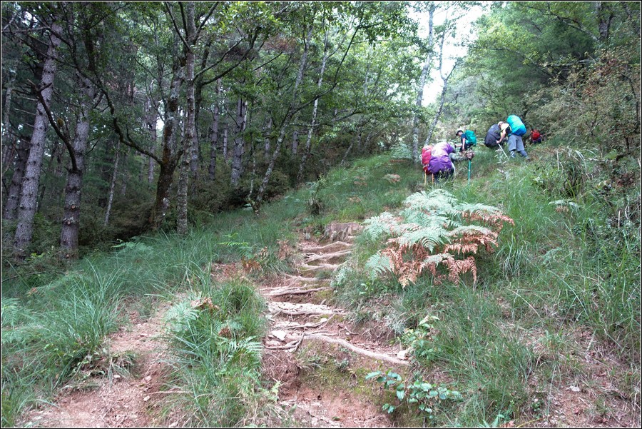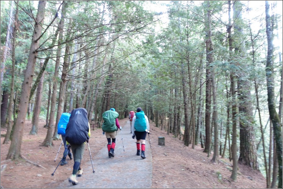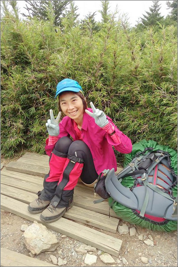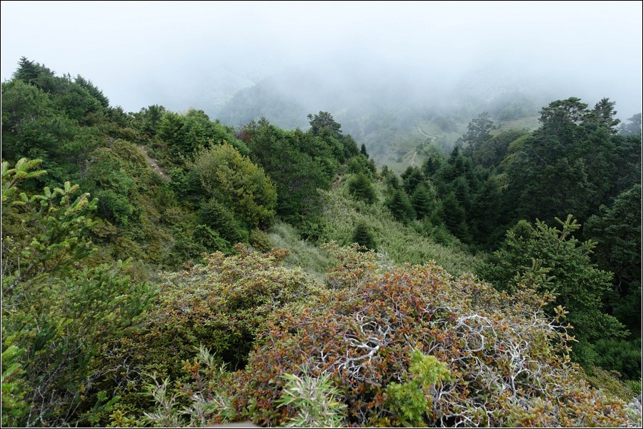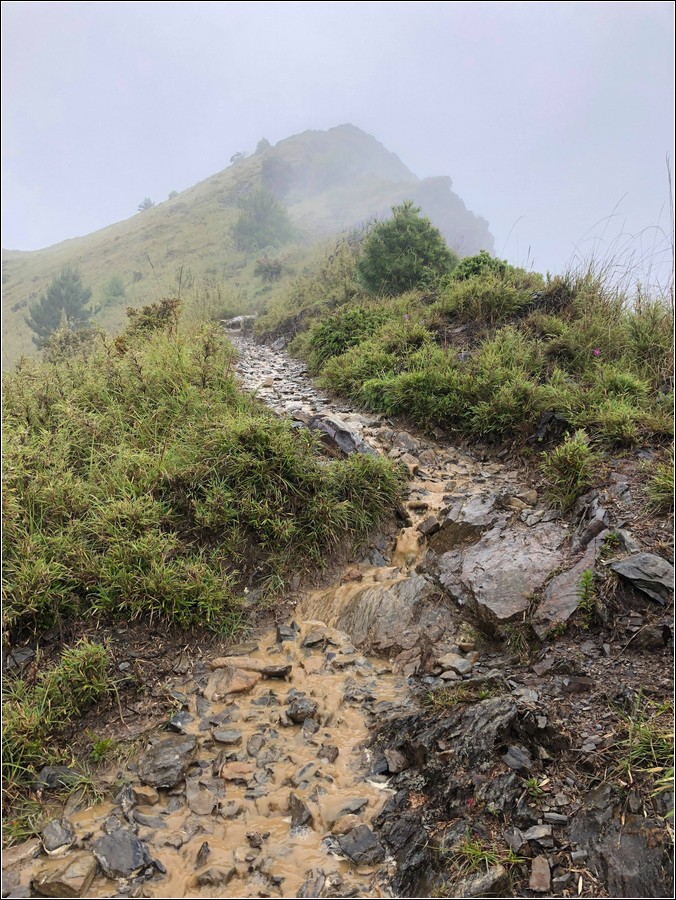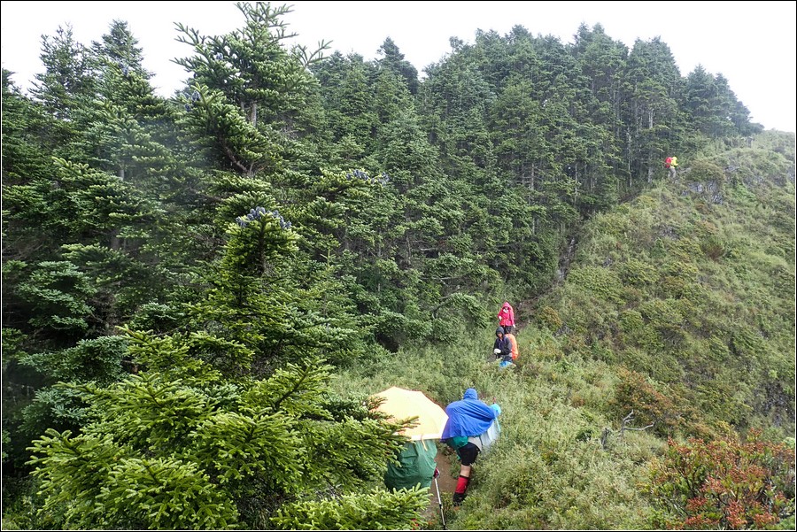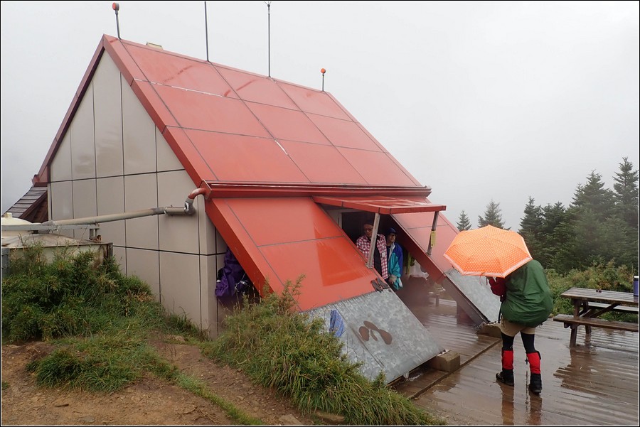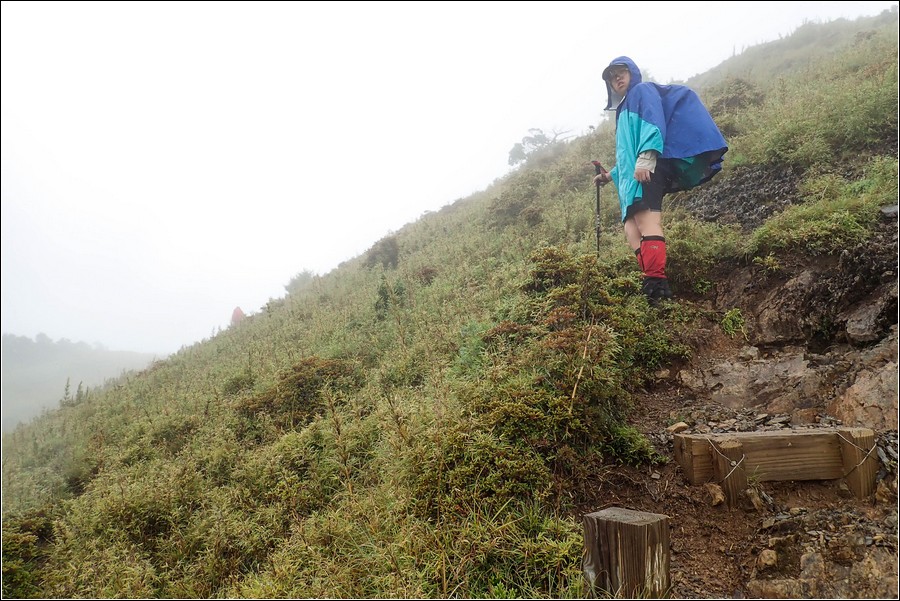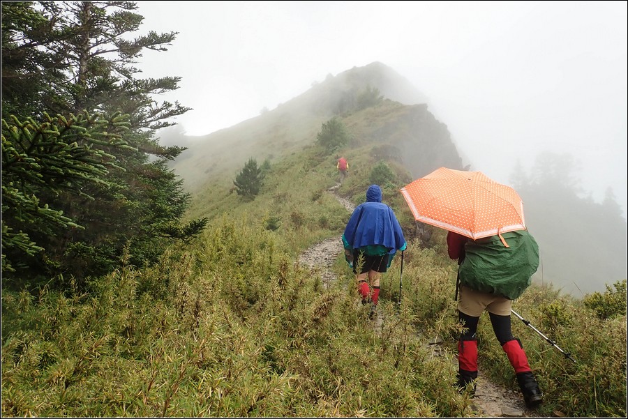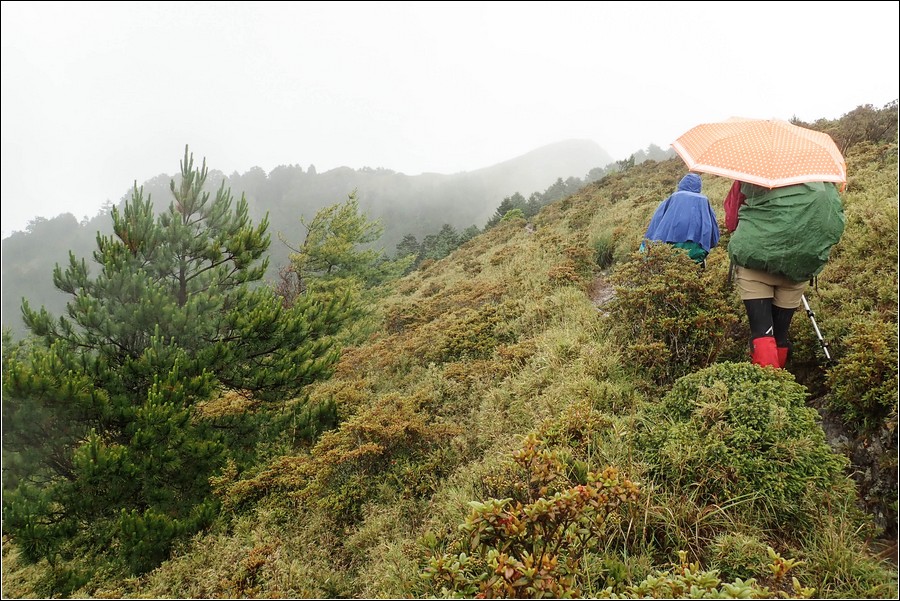 14:16 一小時前還慶幸雲層破了大洞,在3.9K開始落下米粒大雨珠,老天鵝灑水的速度相當快,想說還有1K就能凸到山屋,所以懶得穿雨褲,小狼也懶得穿雨褲爬坡,而小紅帽也懶得穿雨衣、雨褲,直接撐一支小陽傘擋雨。