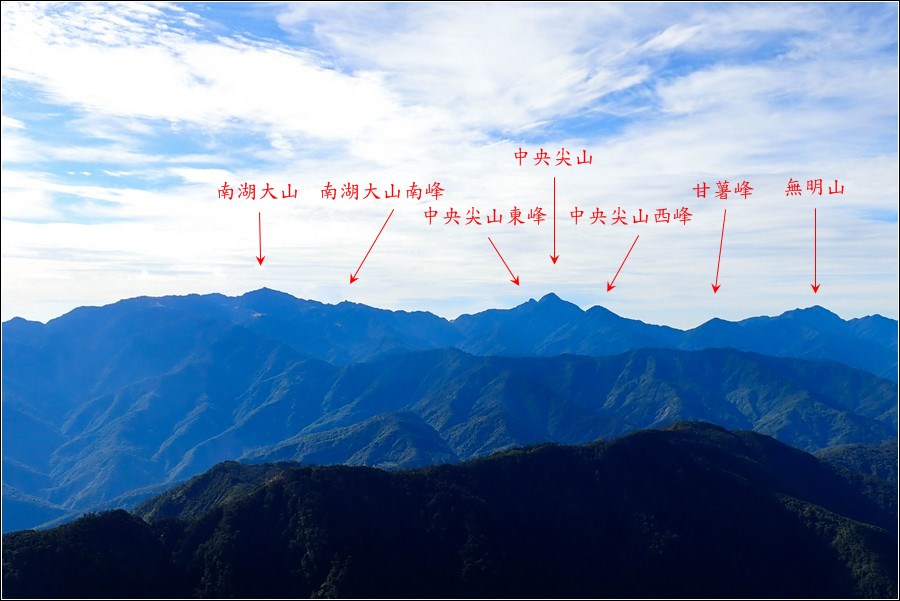 小紅帽認為老狼指的中央尖山看起來不像中央尖山,因此將中央尖山、中央尖山東峰、中央尖山西峰,還有外貌像一個人臉、鼻子尖尖的南湖大山南峰做標示,能一目鳥然。