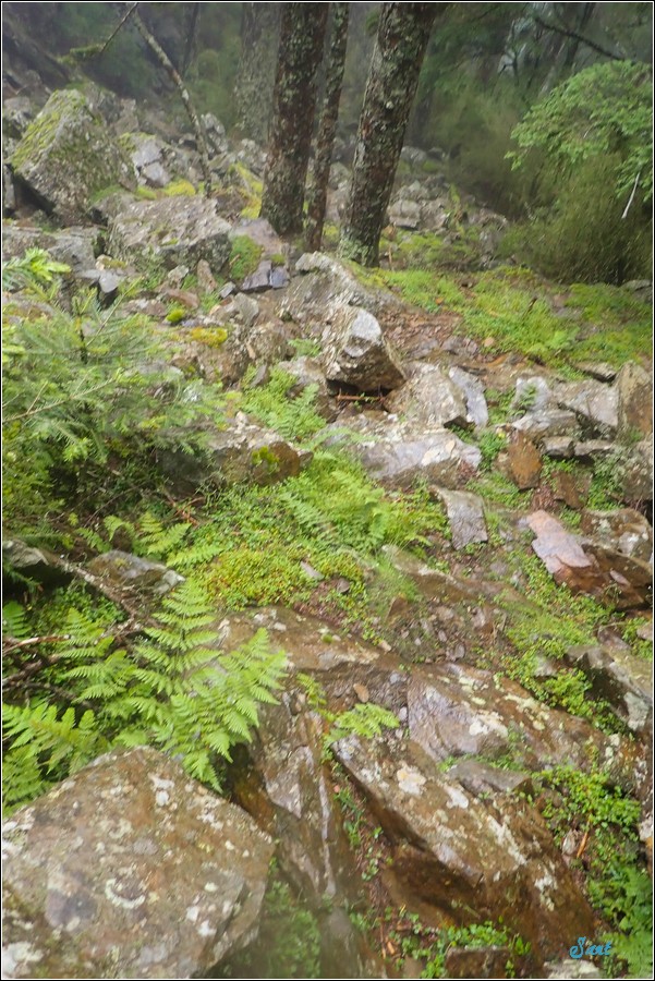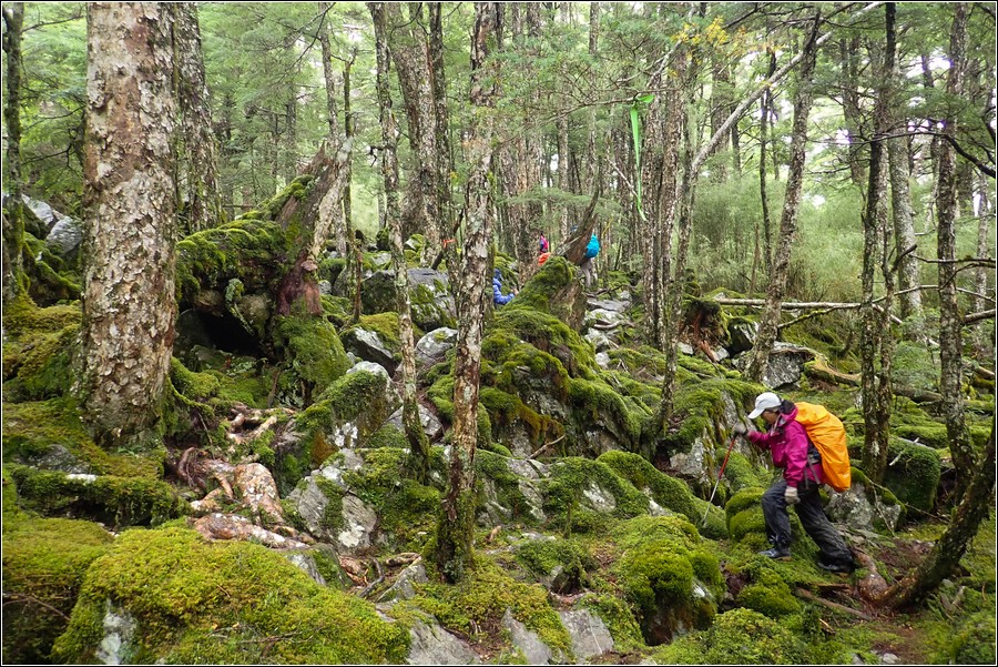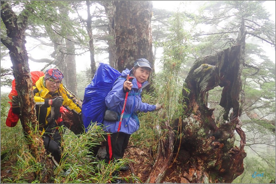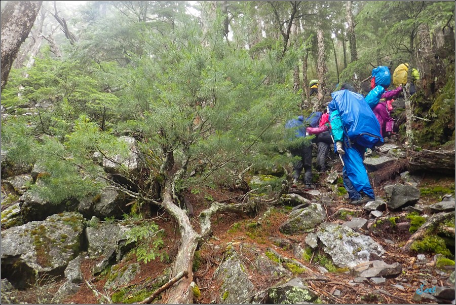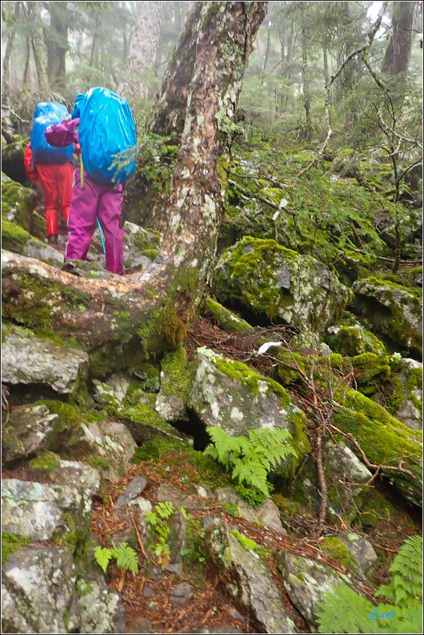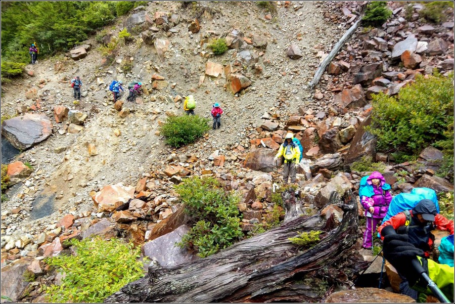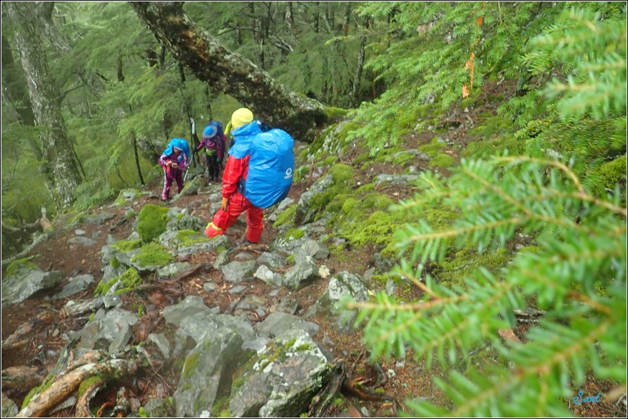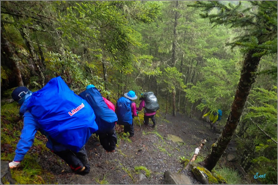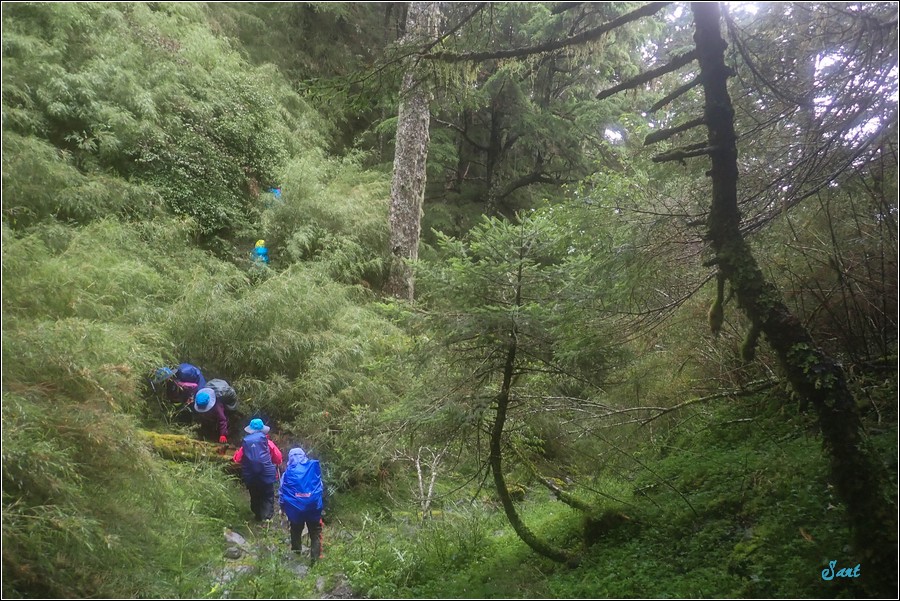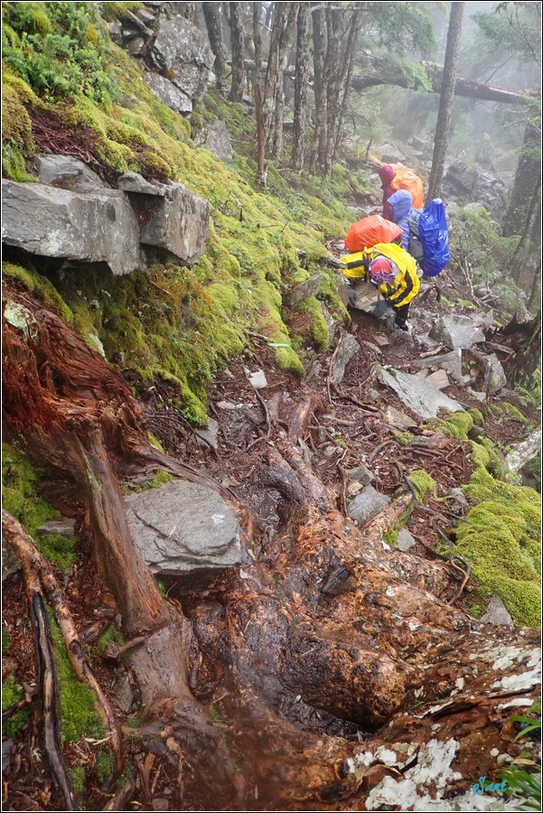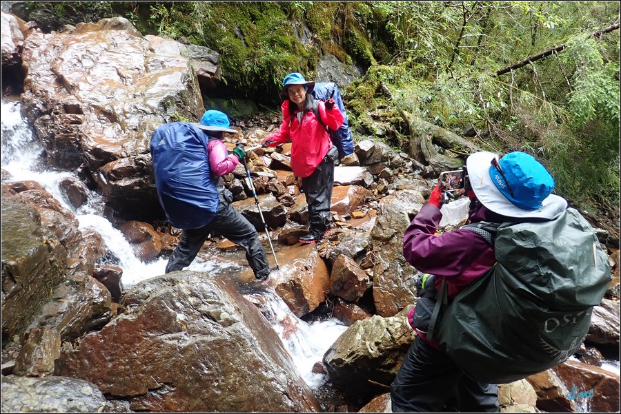 領隊Amy看穿雨鞋的阿德一直滑倒,提醒大家下坡要活用腳跟落地增加煞車阻力,這趟行程幸虧有幾位隊友行走速度一般般,老狼邊走邊拍還能趕上她們的行進速度,所以有機會就嘗試領隊Amy教導的濕滑路段以腳跟著地,避免滑倒。說的簡單實際要確實做到不是很容易做到,因為每個人的走路習慣不同,改正習慣性動作有些困難,老狼只有在看到確實陡滑的下坡路段會提醒自己一定要嘗試,步步為營,不狼就如小紅帽經常念老狼自己走路的方式不對穿什麼鞋子也一樣摔。