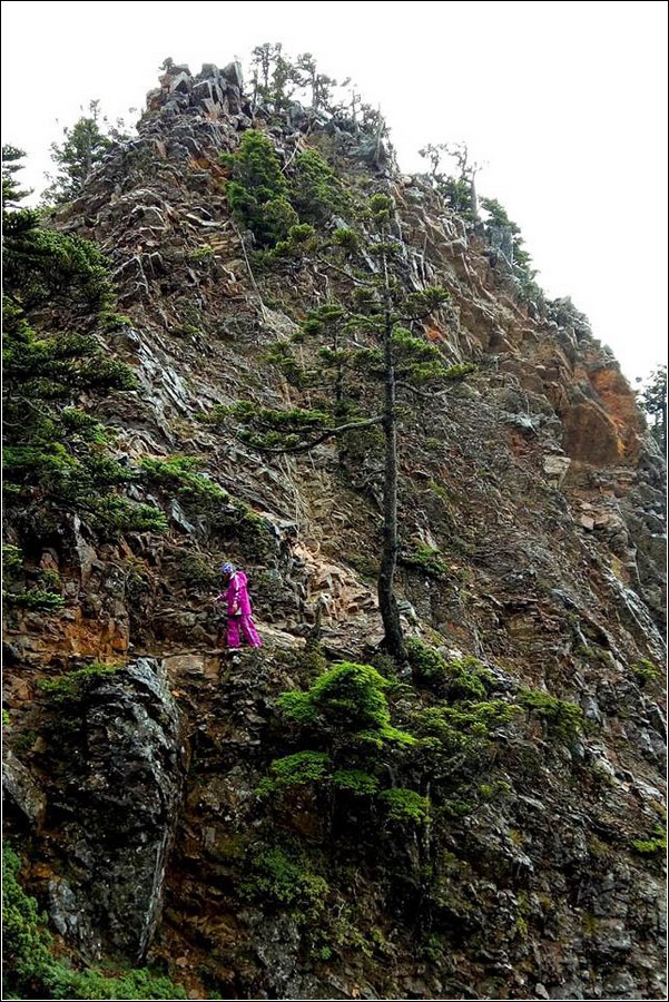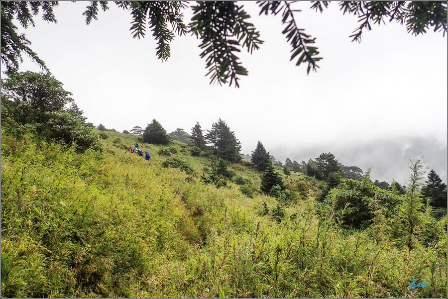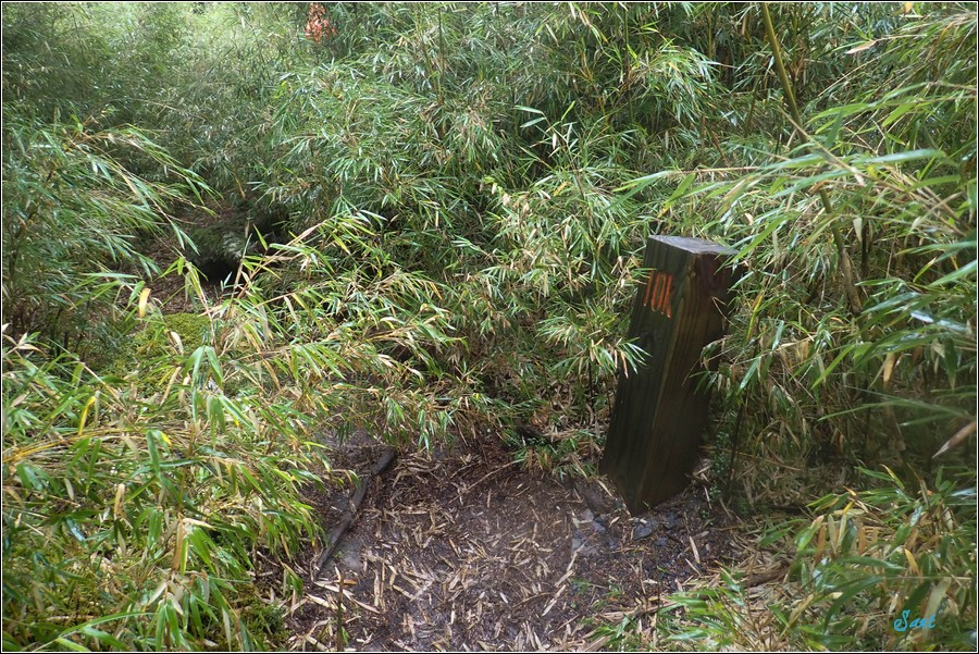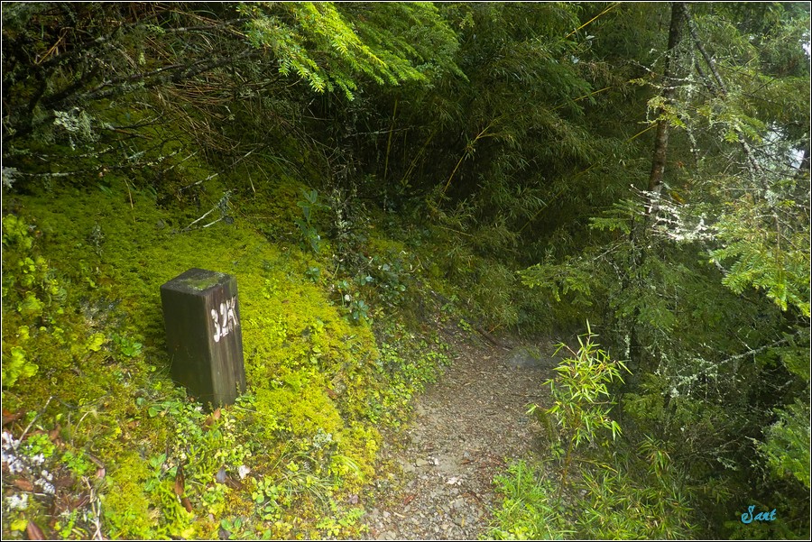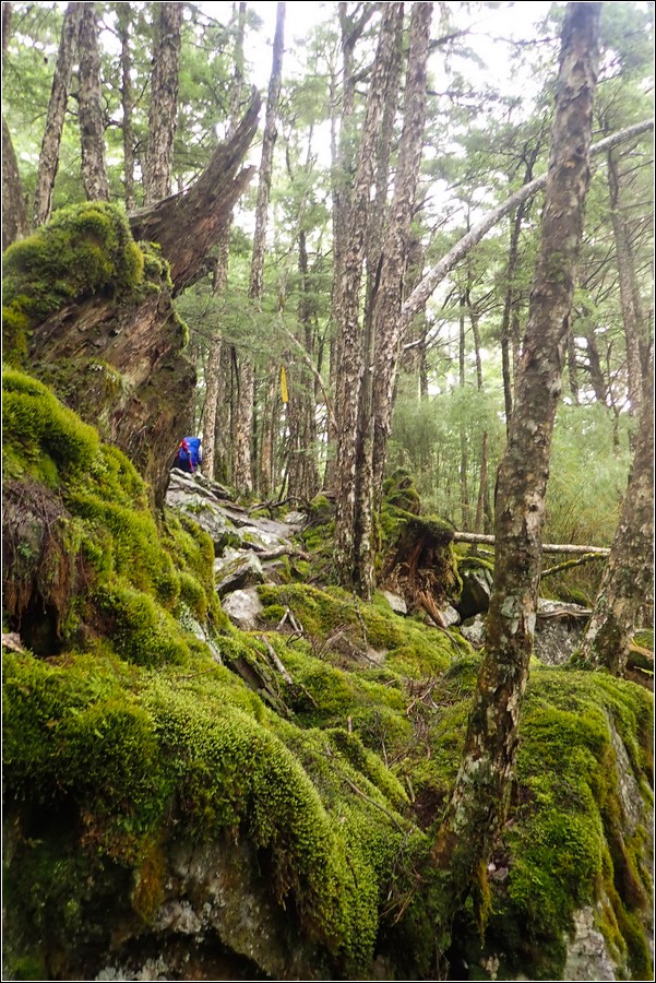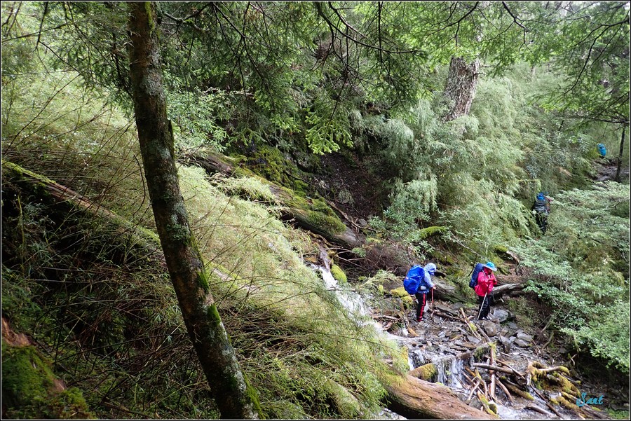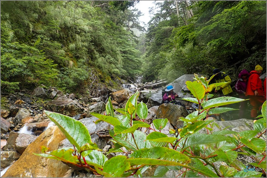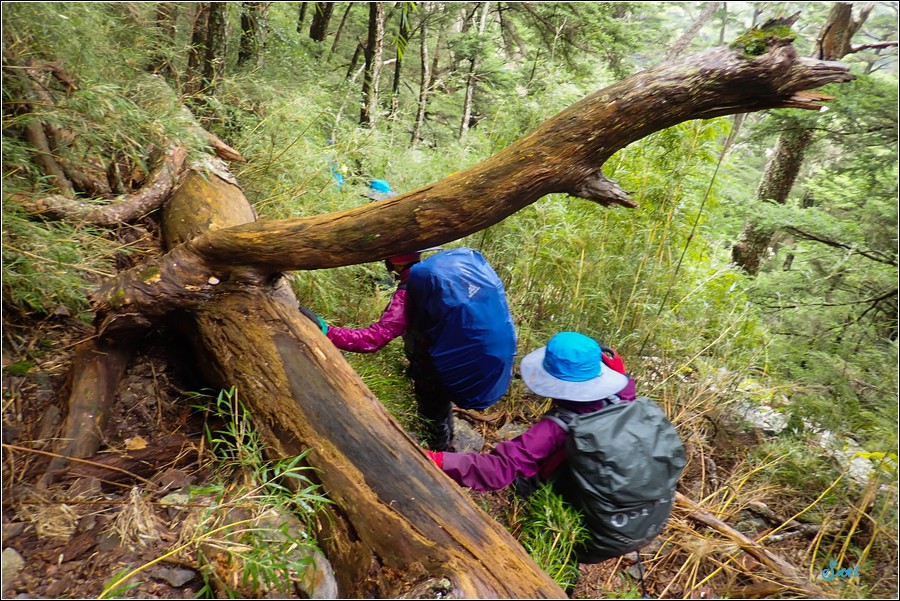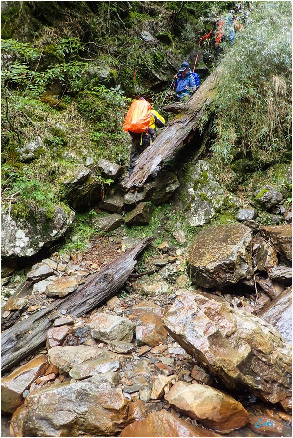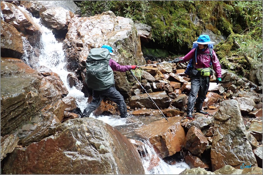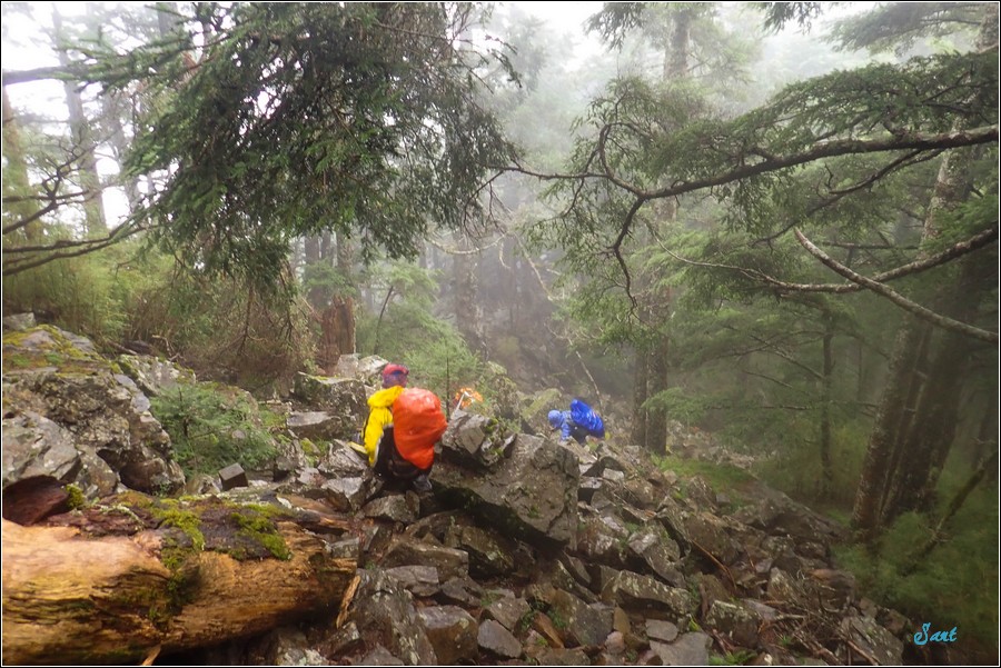 領隊Amy看穿雨鞋的阿德一直滑倒,提醒大家下坡要活用腳跟落地增加煞車阻力,這趟行程幸虧有幾位隊友行走速度一般般,老狼邊走邊拍還能趕上她們的行進速度,所以有機會就嘗試領隊Amy教導的濕滑路段以腳跟著地,避免滑倒。說的簡單實際要確實做到不是很容易做到,因為每個人的走路習慣不同,改正習慣性動作有些困難,老狼只有在看到確實陡滑的下坡路段會提醒自己一定要嘗試,步步為營,不狼就如小紅帽經常念老狼自己走路的方式不對穿什麼鞋子也一樣摔。