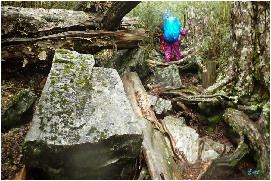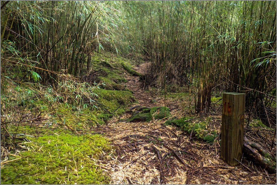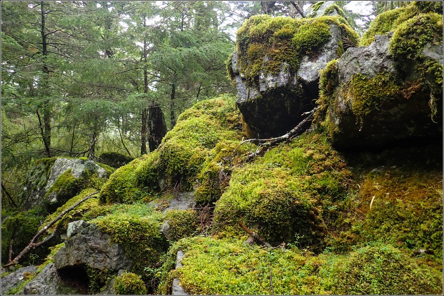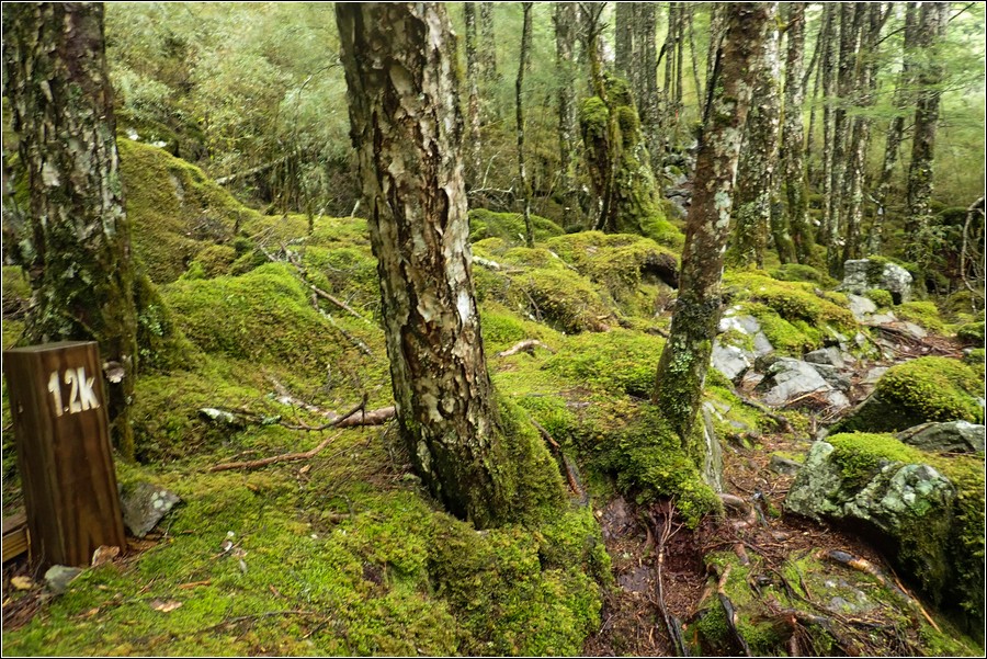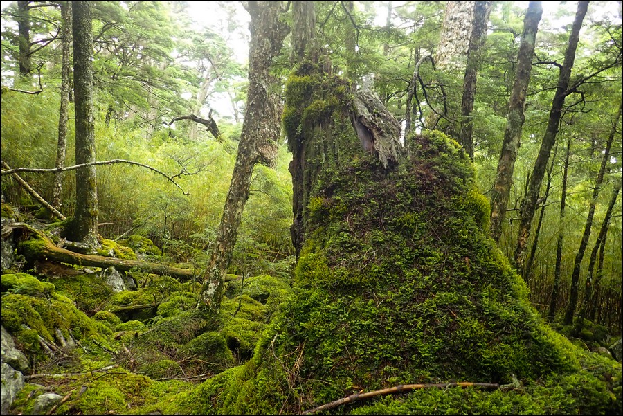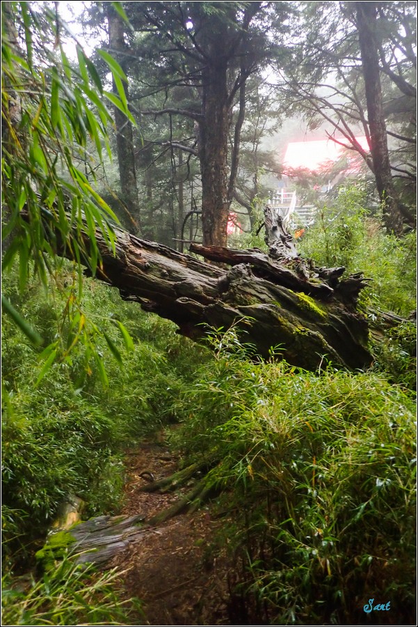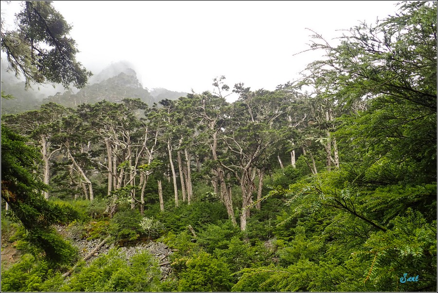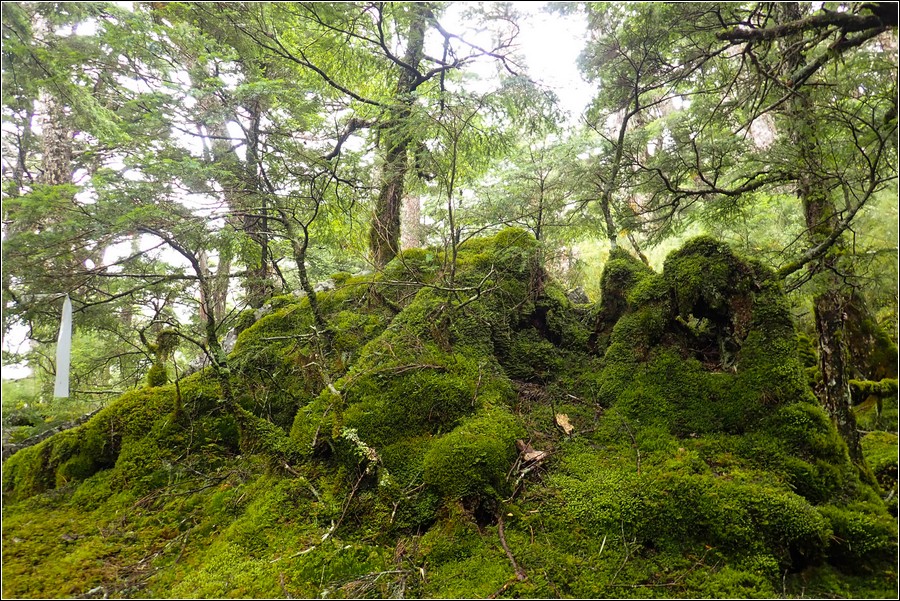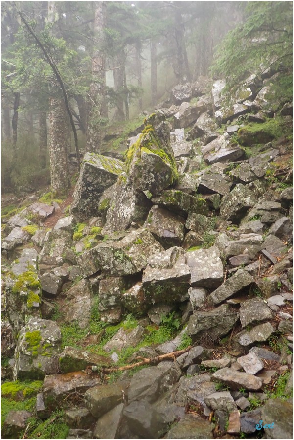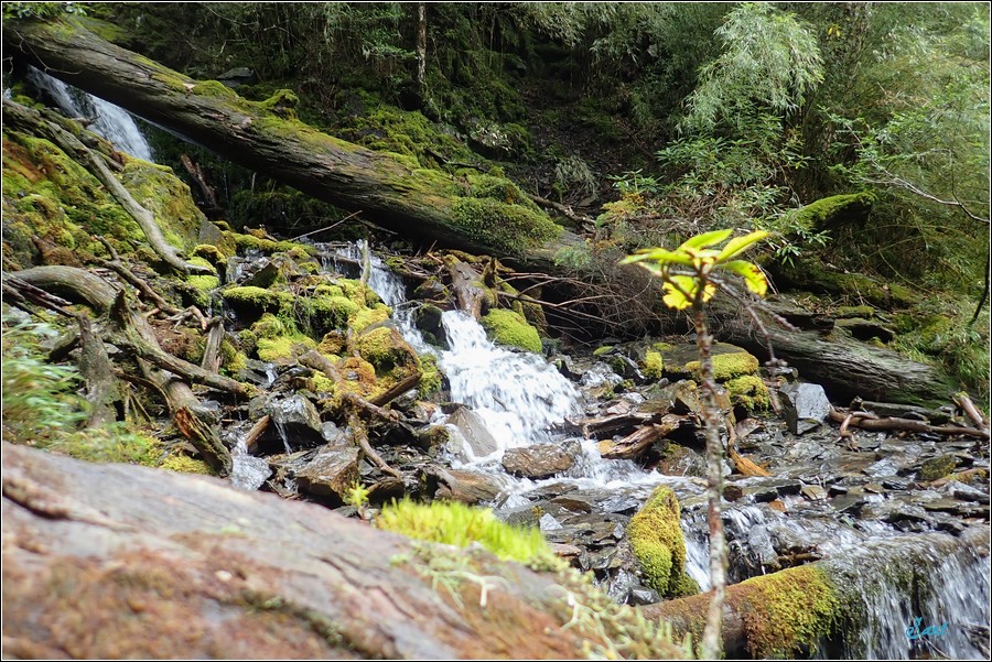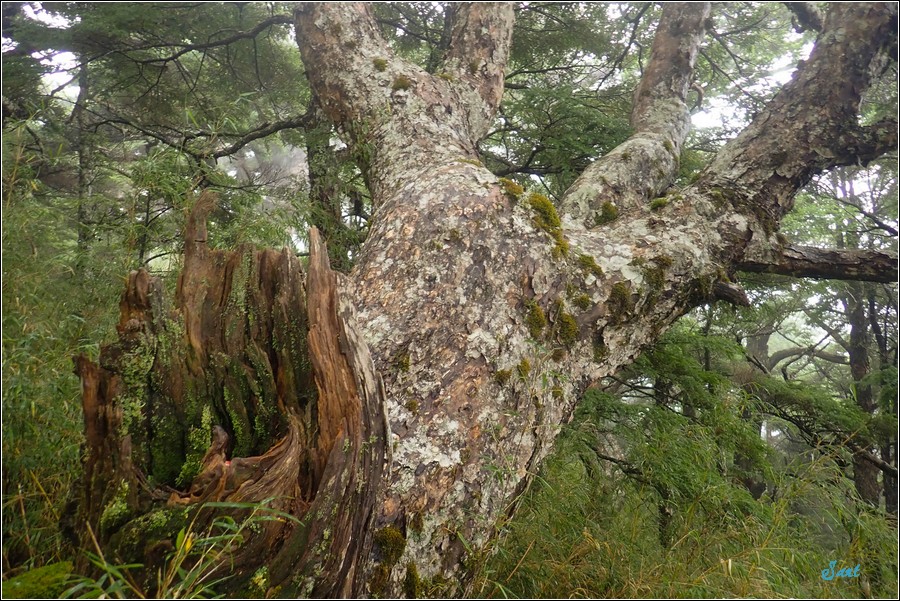 領隊Amy看穿雨鞋的阿德一直滑倒,提醒大家下坡要活用腳跟落地增加煞車阻力,這趟行程幸虧有幾位隊友行走速度一般般,老狼邊走邊拍還能趕上她們的行進速度,所以有機會就嘗試領隊Amy教導的濕滑路段以腳跟著地,避免滑倒。說的簡單實際要確實做到不是很容易做到,因為每個人的走路習慣不同,改正習慣性動作有些困難,老狼只有在看到確實陡滑的下坡路段會提醒自己一定要嘗試,步步為營,不狼就如小紅帽經常念老狼自己走路的方式不對穿什麼鞋子也一樣摔。